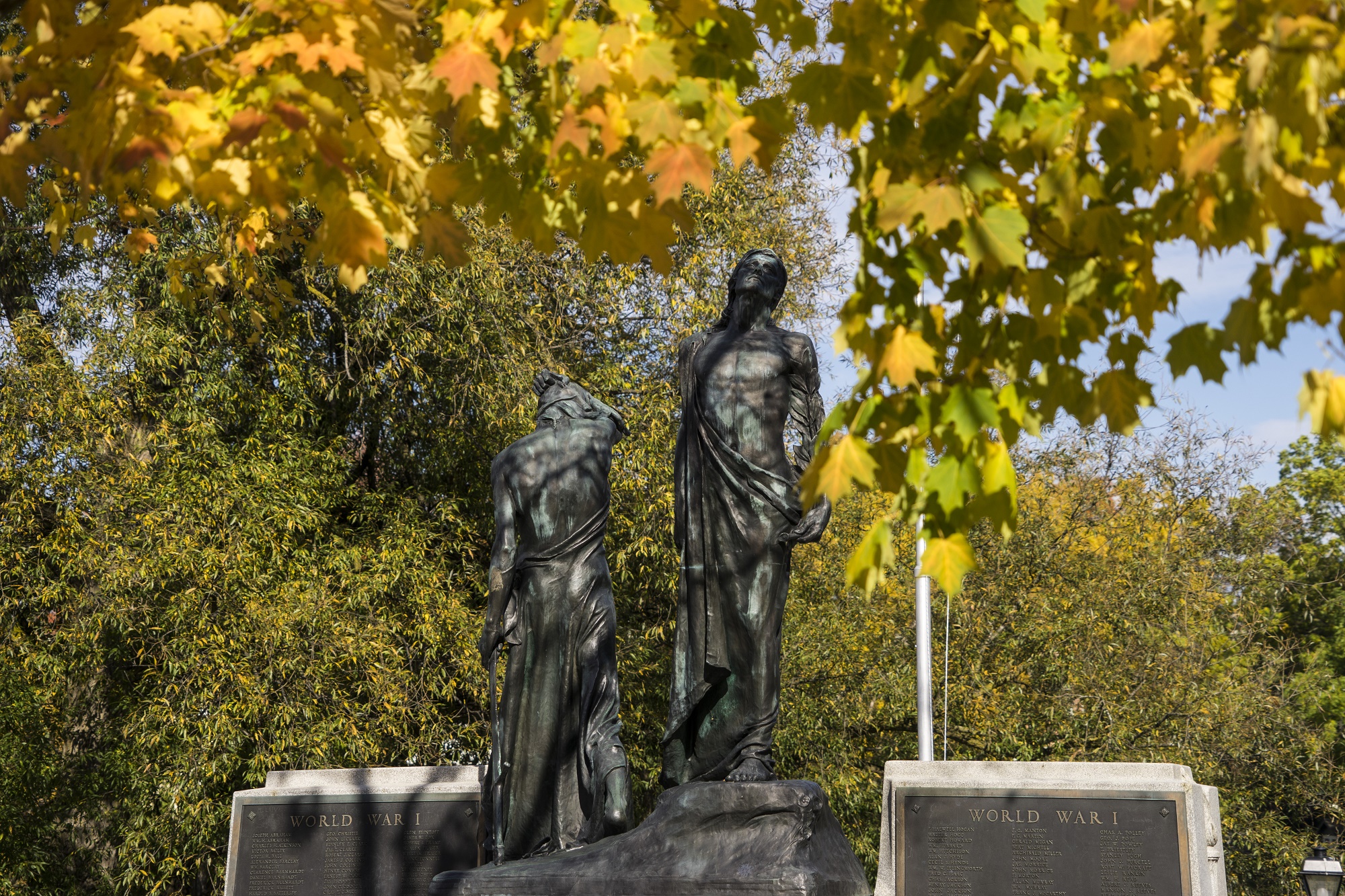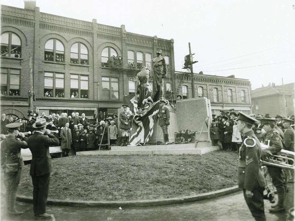 The Stratford War Memorial was erected in 1920 and unveiled on November 6, 1922, in the heart of the City and at the converging point of the four townships. The memorial features two bronze sculptures mounted on one of three granite blocks, which are positioned on a granite base comprised of two layered slabs. The granite came from the Stanstead quarry in Quebec. The figures symbolize the triumph of right over brute force, a theme that Allward had previously explored in his sketch model The Service of Our Men–Crushing the Power of the Sword, 1918, for the proposed Bank of Commerce War Memorial, and would revisit at the Vimy Memorial in France.
