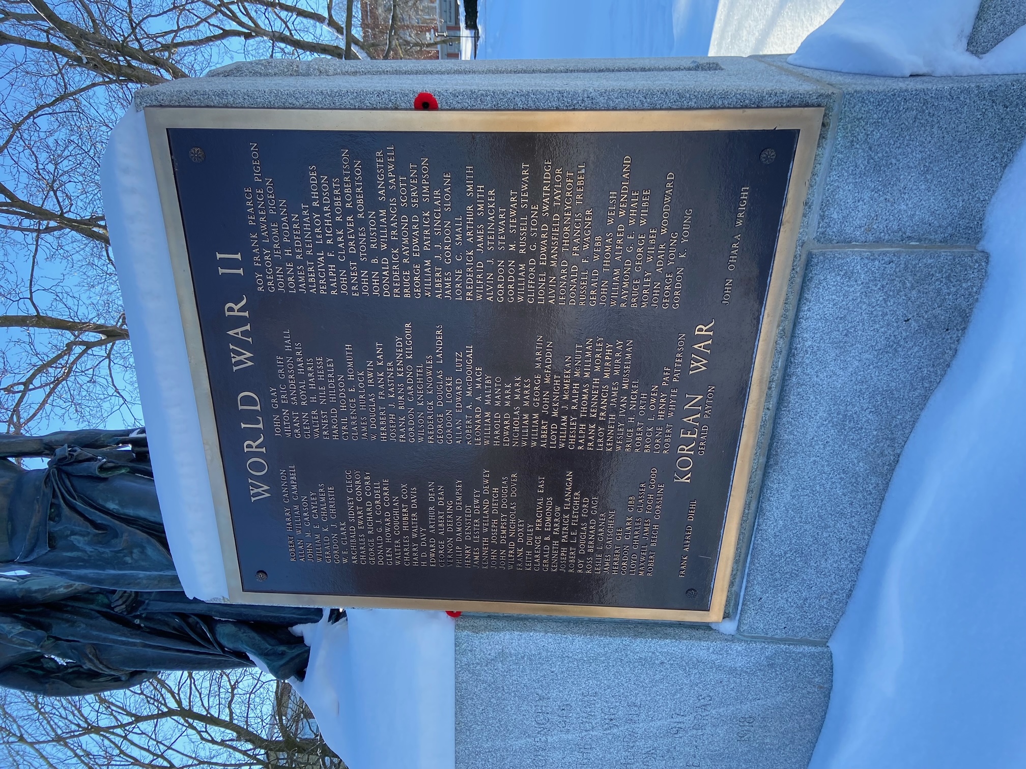 The memorial was modified in 1955 and a rededication ceremony was held on May 9, 1955. Bronze plaques bearing the names of those who died in the First World War, Second World War, and Korean War were installed on the fronts and backs of the two side blocks, covering the original engraved inscriptions, which by then had become almost illegible. In 1961, the memorial was moved to Memorial Park.