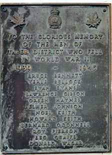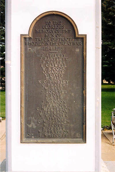 The Taber Branch of the Royal Canadian Legion (GWVA) was organized shortly after the First World War, on April 10th, 1919. In 1920 the members decided to erect a monument to honour the 25 men who did not return from the war. The Monument is entirely the work of the veterans except the statue. A local veteran Thomas Love posed for the picture, the photographs were then sent to Italy, where Master Sculptors completed what is said to be one of the most perfect replica of a Canadian Soldier. The Memorial was unveiled on July 11, 1928. It has since been formally presented to the Town of Taber. All of the branches November 11th ceremonies take place at the cenotaph.
