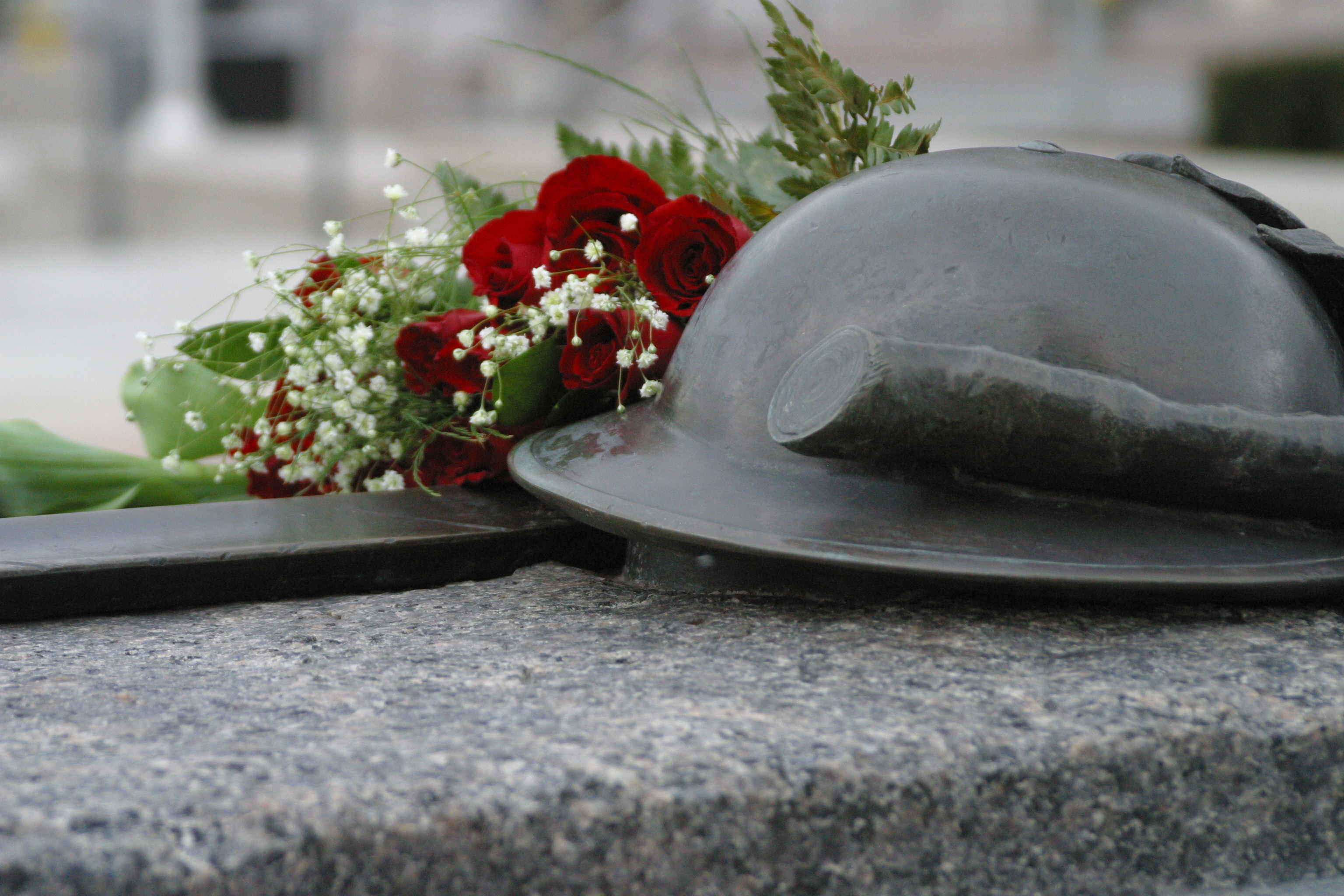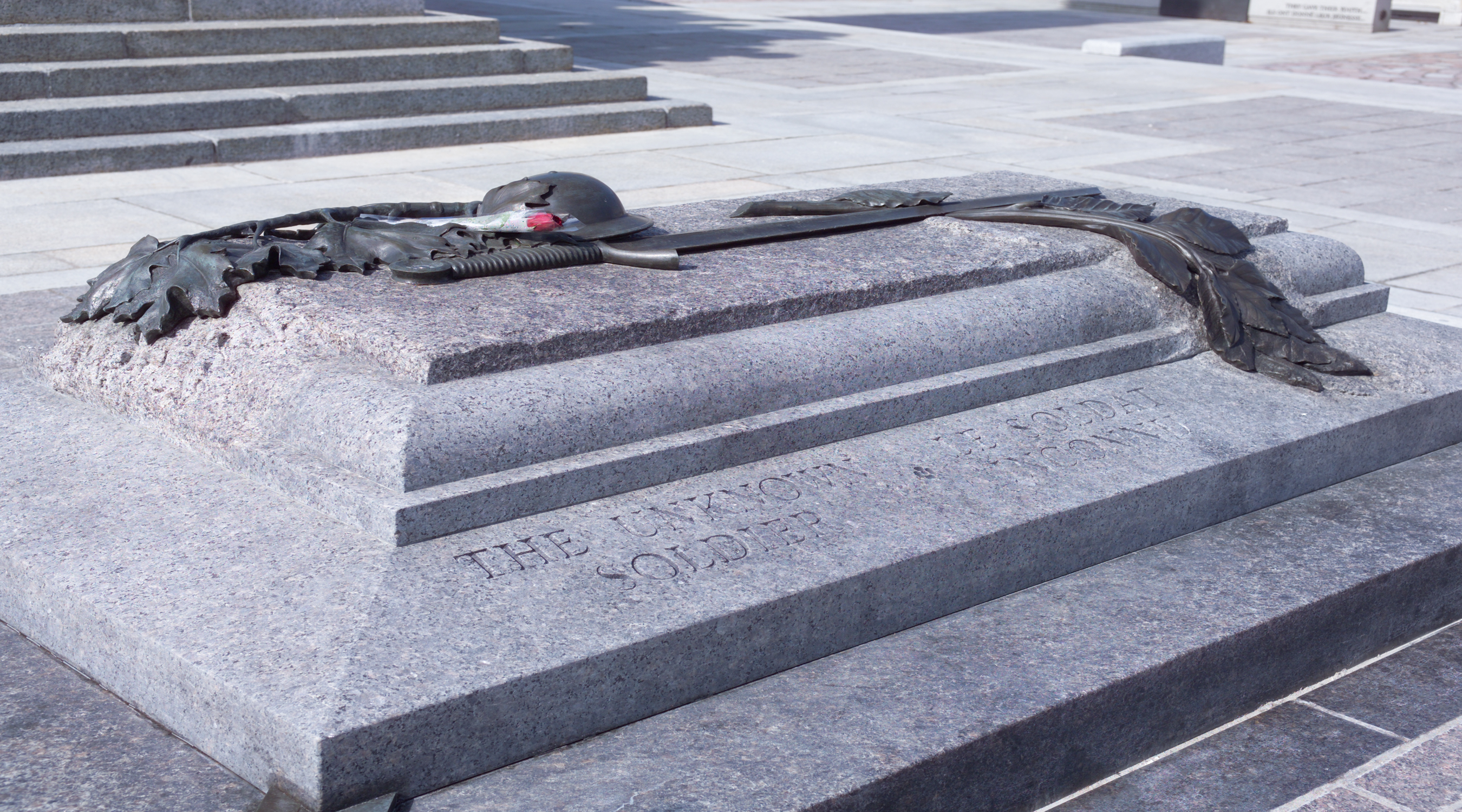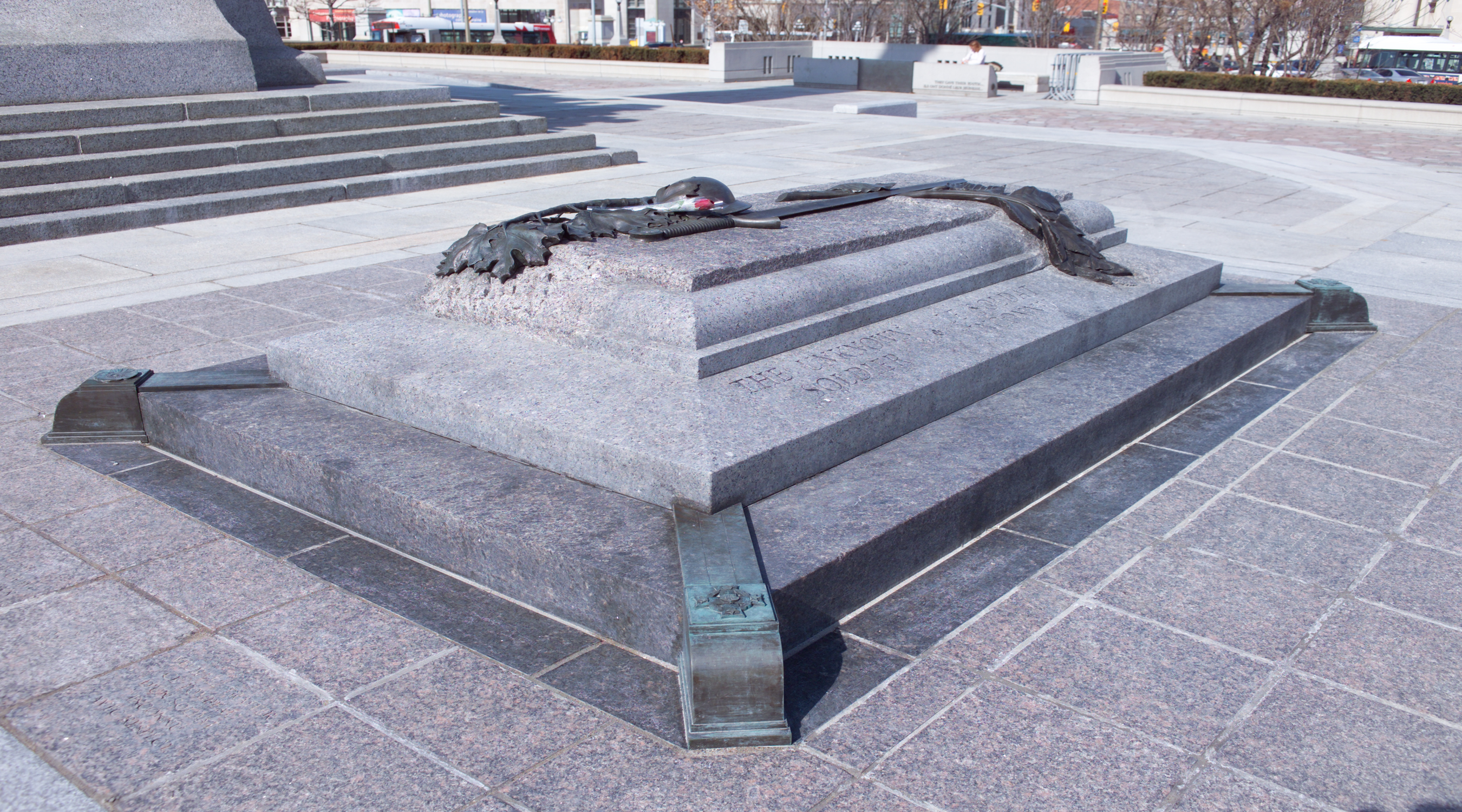 Located on the upper plaza of the National War Memorial, in front of the existing monument, the Tomb consists of a granite sarcophagus enclosing a casket containing the remains of the unknown soldier. A bronze relief sculpture is secured to the top with stainless steel pins. The four corner pieces of the sarcophagus also have bronze relief work.