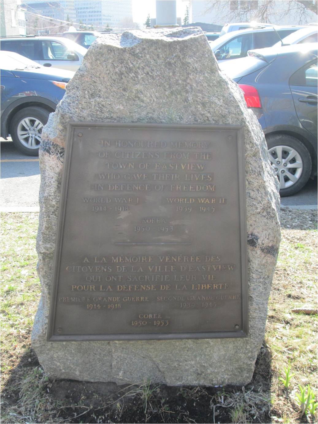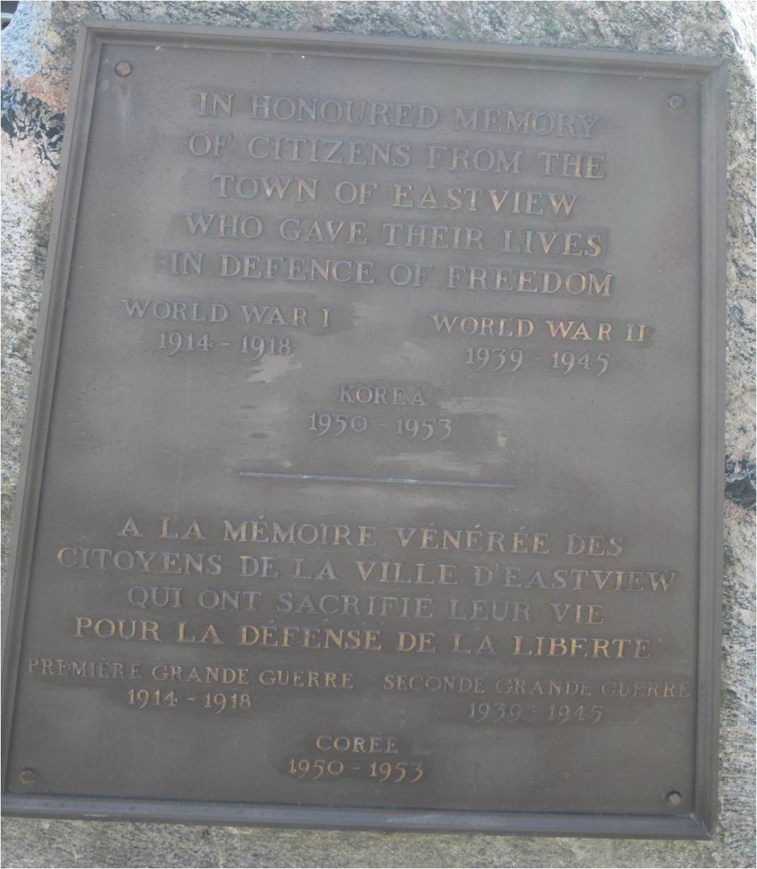 This memorial, a boulder with a bronze plaque, is dedicated to the citizens of the Town of Eastview who gave their lives during the First and Second World War, and the Korean War. It was erected by the Eastview Royal Canadian Legion Branch #462.
