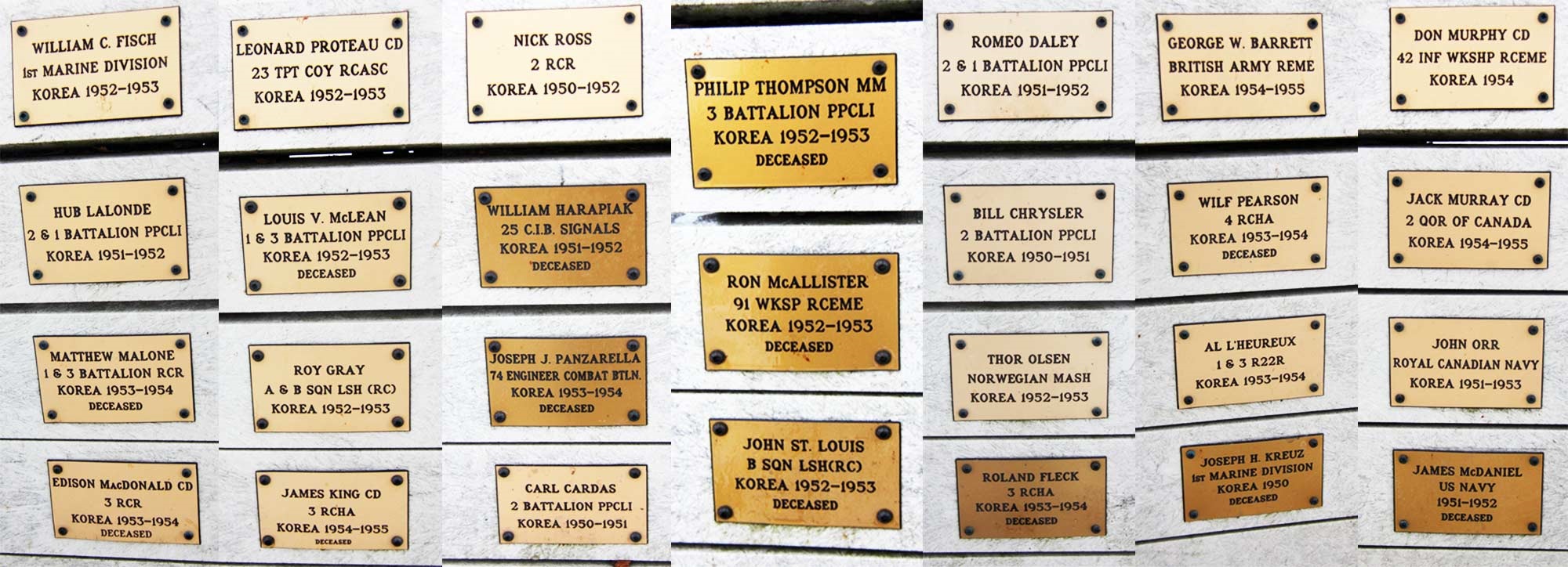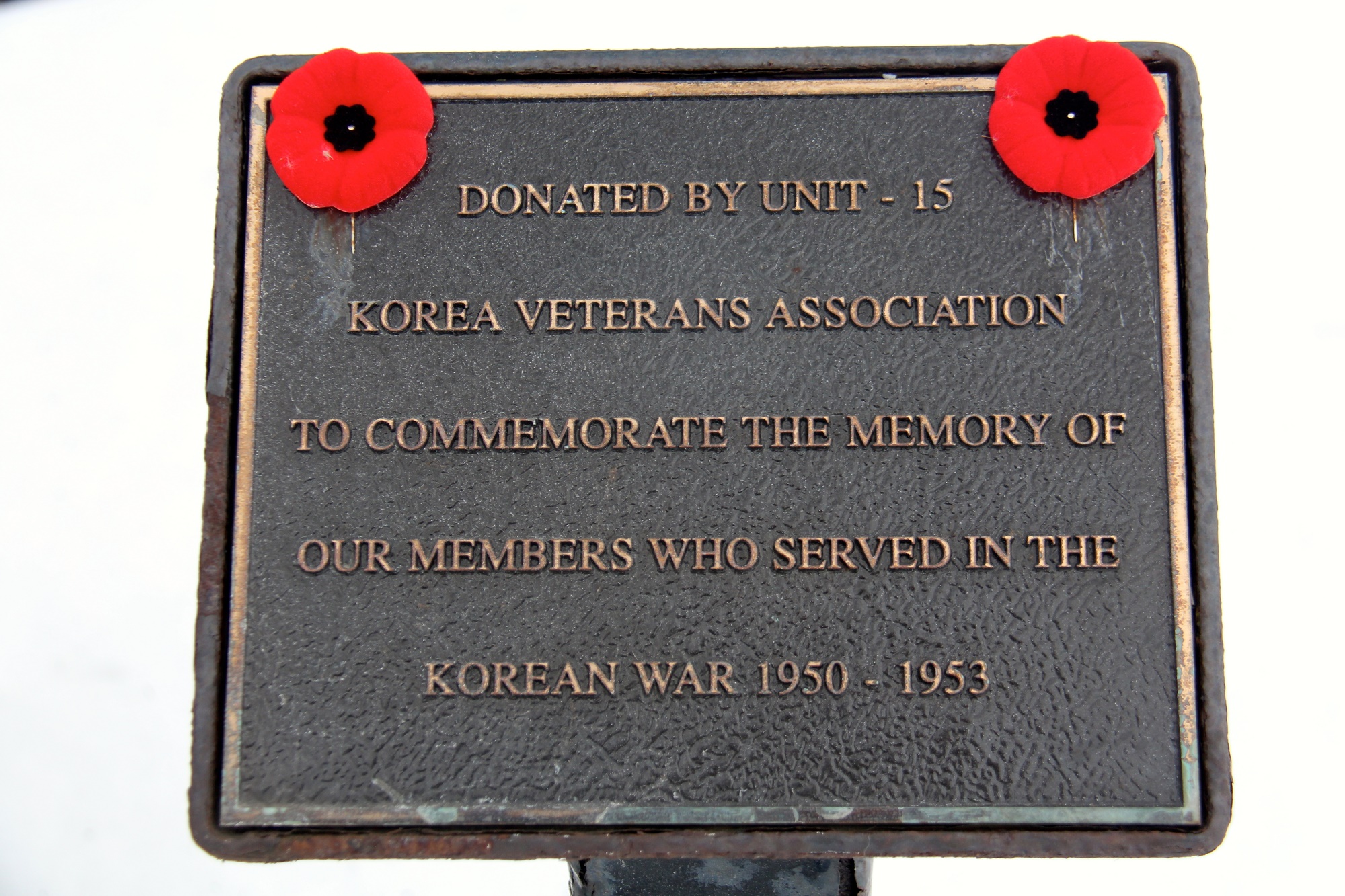 The original wooden Unit 15 Korean War Bench was placed in Lundy's Lane Cemetery in the 1990s. Because it was wooden it needed to be refinished each year, so was replaced with a plastic wood-look bench. The plaques engraved were purchased for $100 each by members of Unit 15, Korea Veterans Association who wanted their names on the bench.