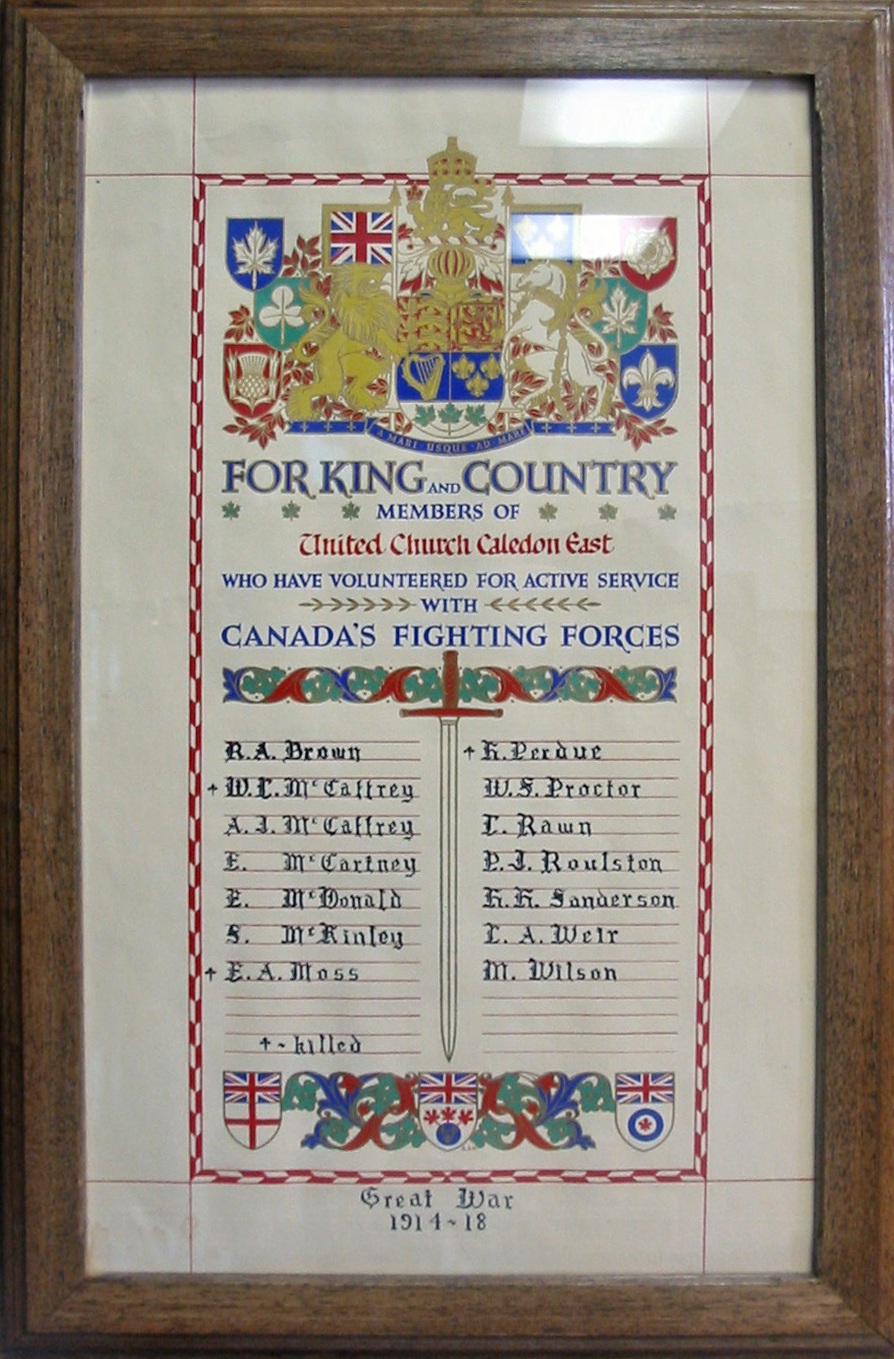 This style of an Honour Roll was designed by A.J. Casson when he worked at Sampson-Matthews, a prominent midtown Toronto lithography and commercial art company. The Honour Roll was created after the Second World War and it is not known when it was unveiled. At some point, the United Church Caledon East First World War Honour Roll was combined into one frame with the United Church Caledon East Second World War Honour Roll and Corporal Wilbert McCaffery Plaque.