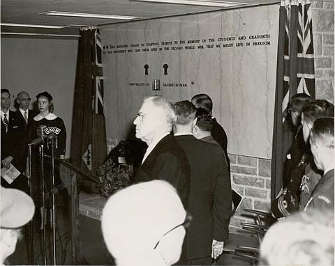 The memorial fireplace in the memorial union at University of Saskatchewan was unveiled on 11 November 1955 as a memorial to lost students and alumni of WWII.