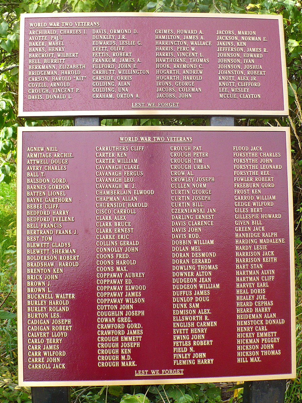 In 2004, the Veterans' Memorial Committee erected three brass plaques listing the names of the Veterans who served during the war years. Three additional plaques honouring Veterans from Smith, Ennismore and Curve Lake were dedicated on September 14, 2008, containing 131 names that were missed in 2004.