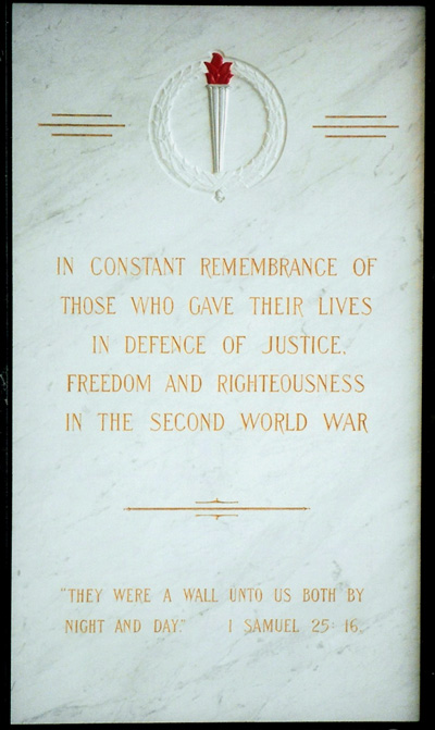 In 1949, the City of Victoria opened and dedicated the Victoria Memorial Arena which was named for and dedicated to the Second World War Veterans. In the lobby, was an alcove twenty feet across in which stood an eight feet by four feet white marble plaque immortalizing the service of Second World War Veterans. It was flanked by the Canadian Flag and the Canadian Red Ensign. The arena stood until 2003 when it was demolished to make room for the present Save-On-Foods Memorial Centre.