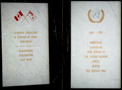 Veterans Memorial Wall was unveiled on April 16, 2005. The curving wall is 33 feet wide and stands over 11 feet tall. It consists of five white Carrara marble plaques set into white veined, black Vancouver Island marble. The original Second World War plaque is centered in the wall.
