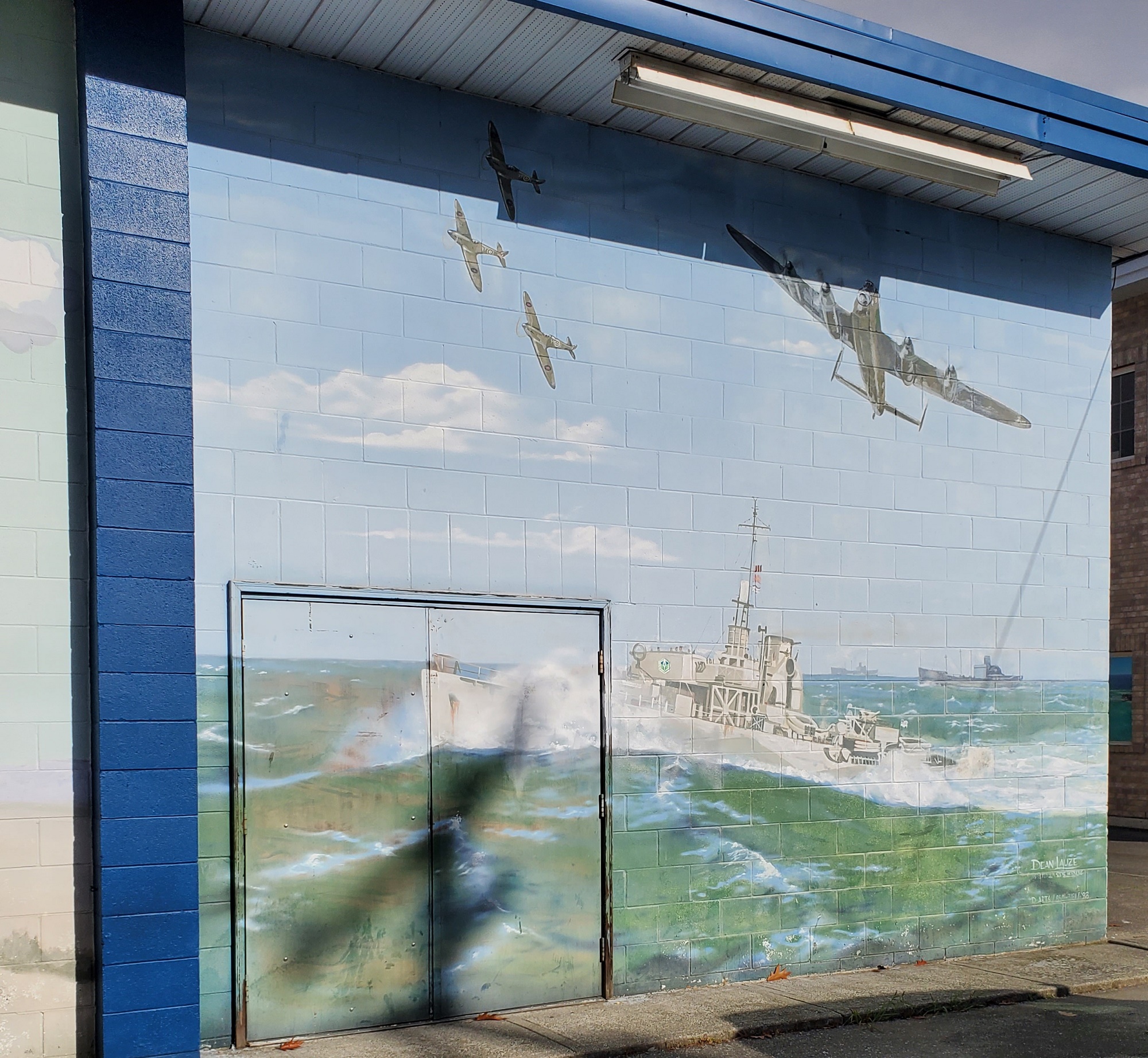 The Veterans' Mural was erected in 1998 by the Royal Canadian Legion Branch No. 265 and is dedicated to war time Veterans. It was painted by artist Dean Lauze. The first panel represents the Canadian Army with Canadian tanks and soldiers. The third panel represents the Canadian Air Force and Navy with Canadian planes and ships.