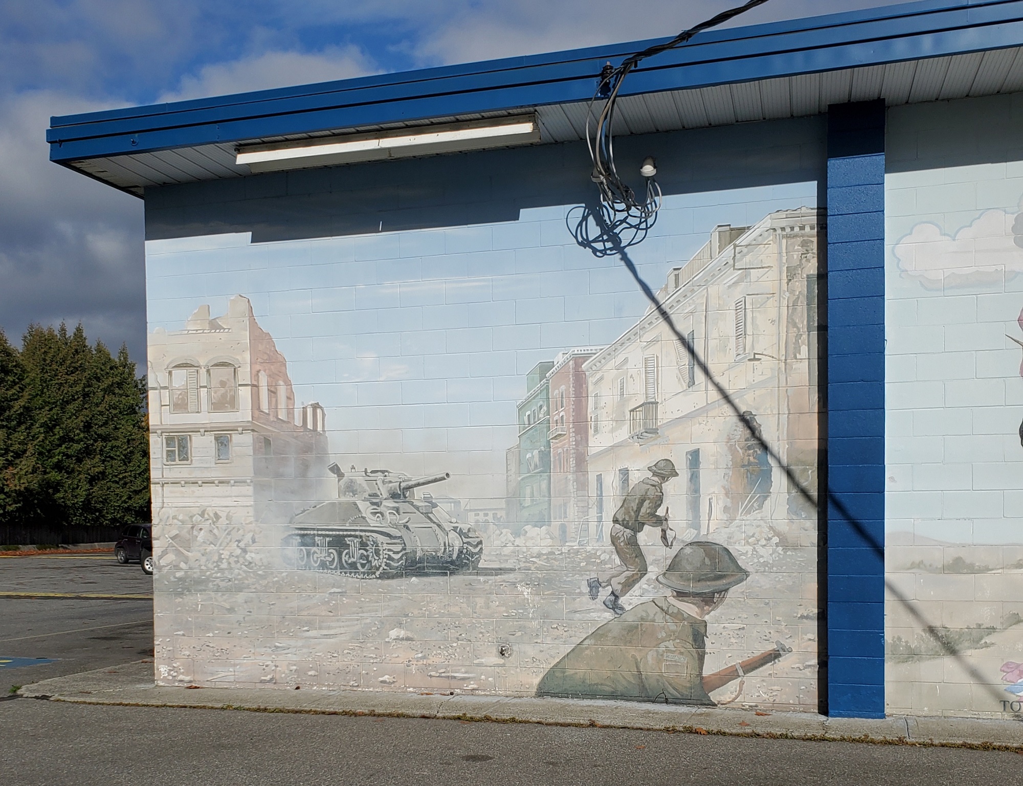 In the mural, Dean changed out some of the flags to represent the Second World War. Not all the countries could be incorporated in the design. After consulting with the legion, it was decided to show flags from Canada, USA, Great Britain, France, Belgium, Norway, Poland and the Netherlands. The fallen Veteran was replaced with a sepia toned image of Vimy Ridge and a Veteran holding hands with two of his grandchildren in front of the Canadian National Vimy Memorial. An important message at the bottom - “To all men and women who served their countries in times of war” is a blanket statement that includes all men and women, all countries (even the enemy countries of the time), and all wars.