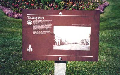 The park and its monument are not military memorials, but the name does refer to victory in war. After the Second World War, Hugh Gilchrist who was Red Deer Parks Superintendent and a war veteran, decided to name the park - Victory Park, as it was shaped like a V and the timing was appropriate (after the war). The land was designated park area and just happened to be shaped like a V because of surrounding streets.