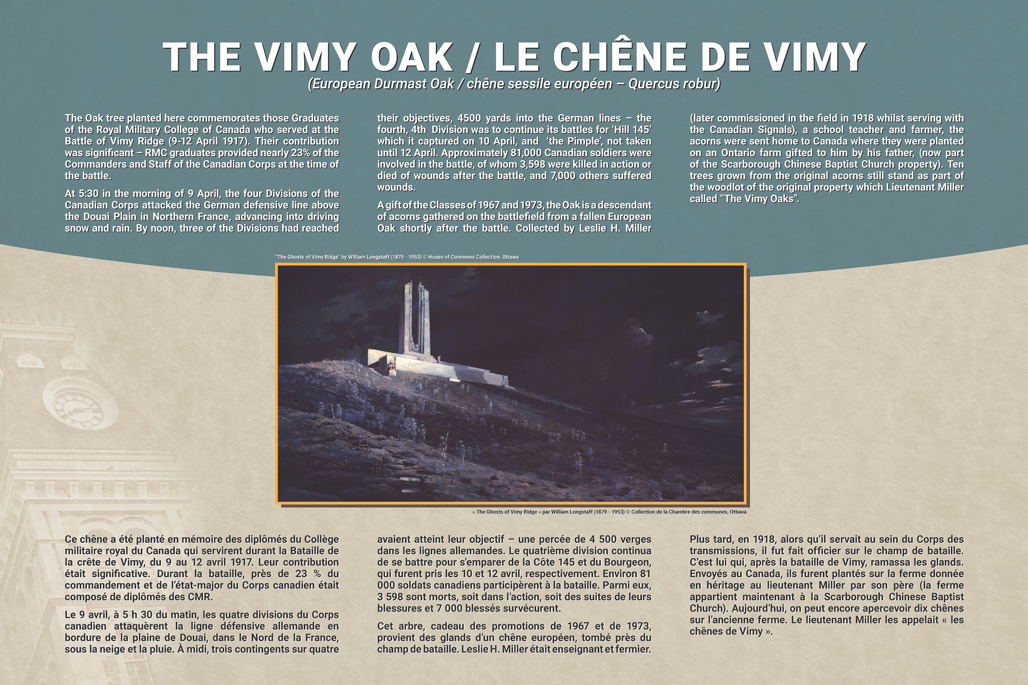 The Vimy Oak was unveiled in November 2018 to commemorate graduates of the Royal Military College of Canada who served at the Battle of Vimy Ridge. Their contribution was significant – graduates provided nearly 23% of the commanders and staff of the Canadian Corps at the time of the battle. The dedication in 2018 coincided with the 100th anniversary of the Battle of Vimy Ridge. Vorster-Elaison Landscape Artists of Kingston provided the design for the Royal Military College of Canada Vimy Oak Memorial.