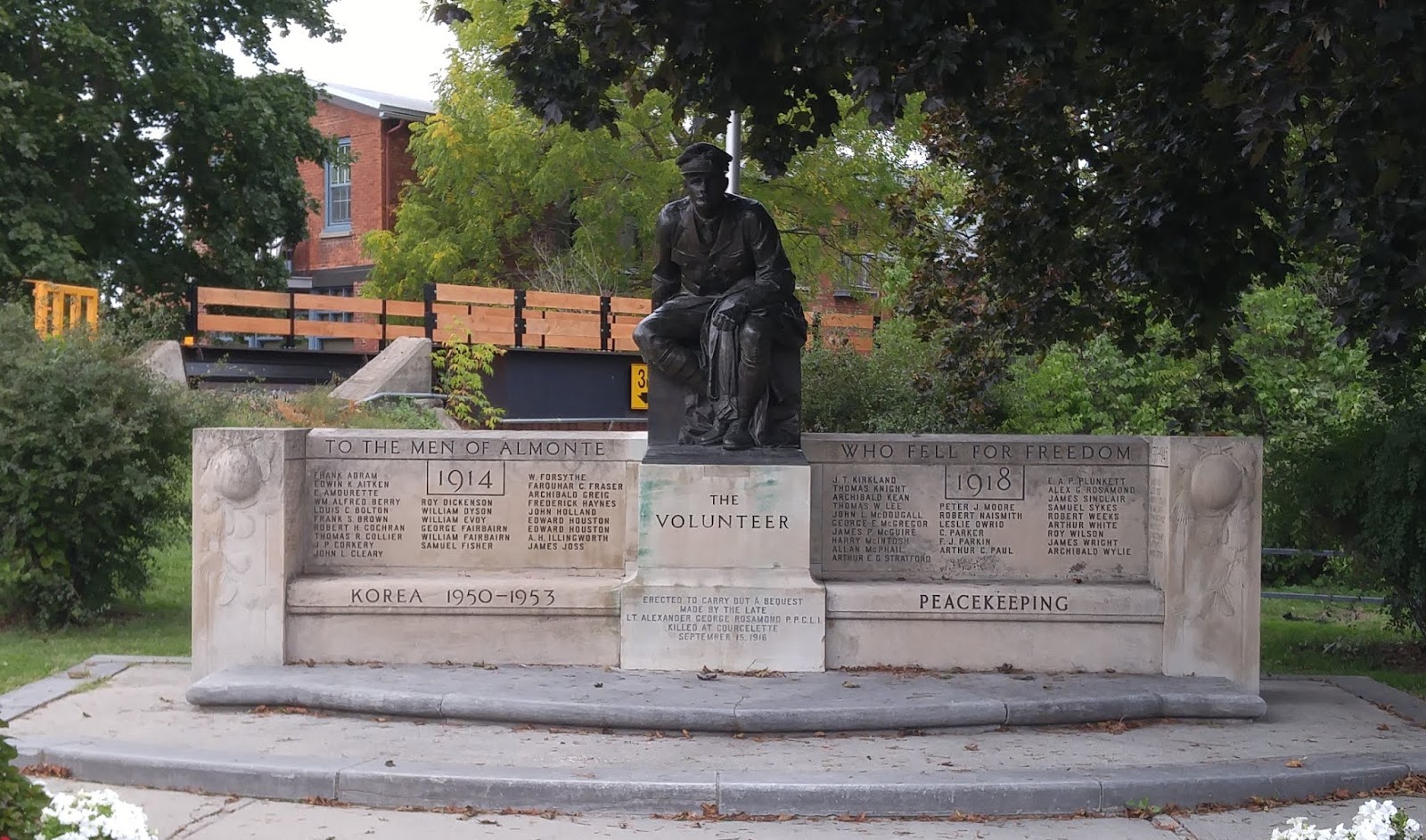 The Volunteer was sculpted by R. Tait McKenzie and dedicated on 11 September 1923. It was constructed in memory of the men of Almonte who fell in the First World War. The memorial was requested by Alexander Rosamond in a letter he wrote to his family in July 1916. He was a lieutenant in the Princess Patricia Canadian Light Infantry and if he did not return, he hoped a memorial could be built in a central place in Almonte "to the men of Almonte who fell for freedom."