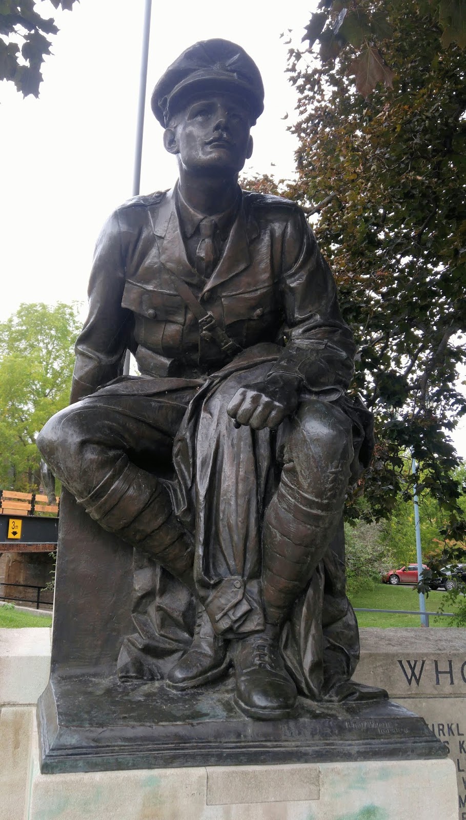 Lieutenant Alex Rosamond was killed in action at Courcelette during the Battle of the Somme on 15 September 1916. His widow asked Dr. Robert Tait McKenzie, a former local, to create the memorial. Dr. McKenzie, a professor at the University of Pennsylvania, returned after an absence of nearly 40 years to construct this monument. Most of the work was done at the home of Mrs. Alex Rosamond in the garage at Pinehurst on Union Street. Mrs. Rosamond wanted the memorial to have a likeness to her late husband and the statue was based on photographs of him. The finished work looked so much like her late husband that she had it changed. She also left $1000.00 for the memorial's upkeep.