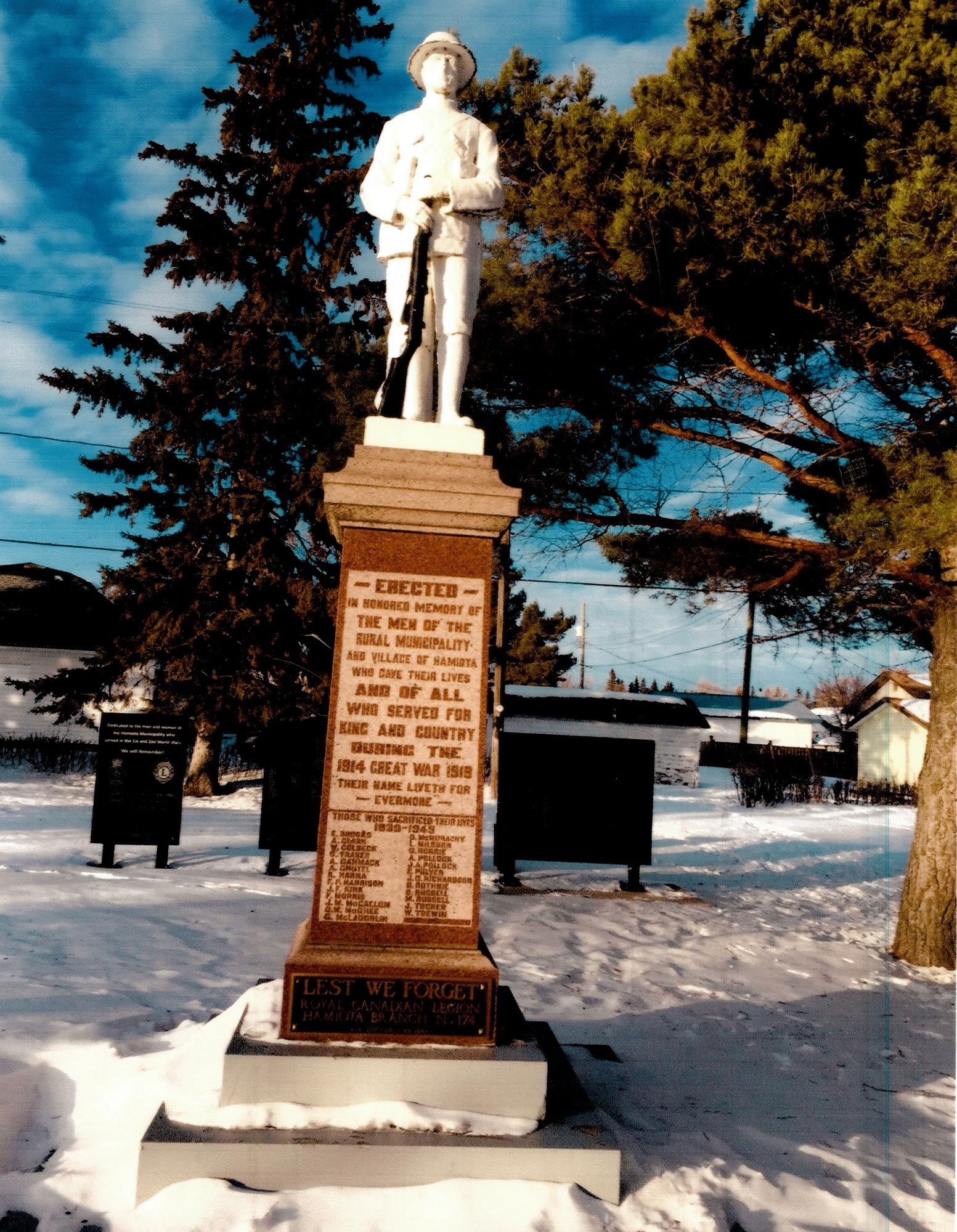 Shortly after the First World War, the Village of Hamiota and the Rural Municipality of Hamiota formed a committee to build a monument. The War Memorial was unveiled on September 27, 1921, and dedicated to First World War Veterans who made the ultimate sacrifice. The shaft was made of Scottish granite and stands on a base constructed by local volunteers. The statue of a soldier was made in Italy of Carrara marble. The soldier is depicted in uniform wearing a helmet. He gazes straight ahead and stands at ease with both hands holding a reversed rifle in front of him.