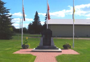 Dedicated to the men of Wawota and area who gave their lives during the First and Second World Wars, by the Wawota Royal Canadian Legion Branch 113, this memorial was unveiled August 3, 2008. It is made of black granite shipped from China, bordered by grey Canadian granite and sitting on a base of grey granite which in turn rests on a cement base. It is flanked by the Red Ensign which all these men fought under during the First and Second World Wars, the Canadian flag and the Saskatchewan flag.