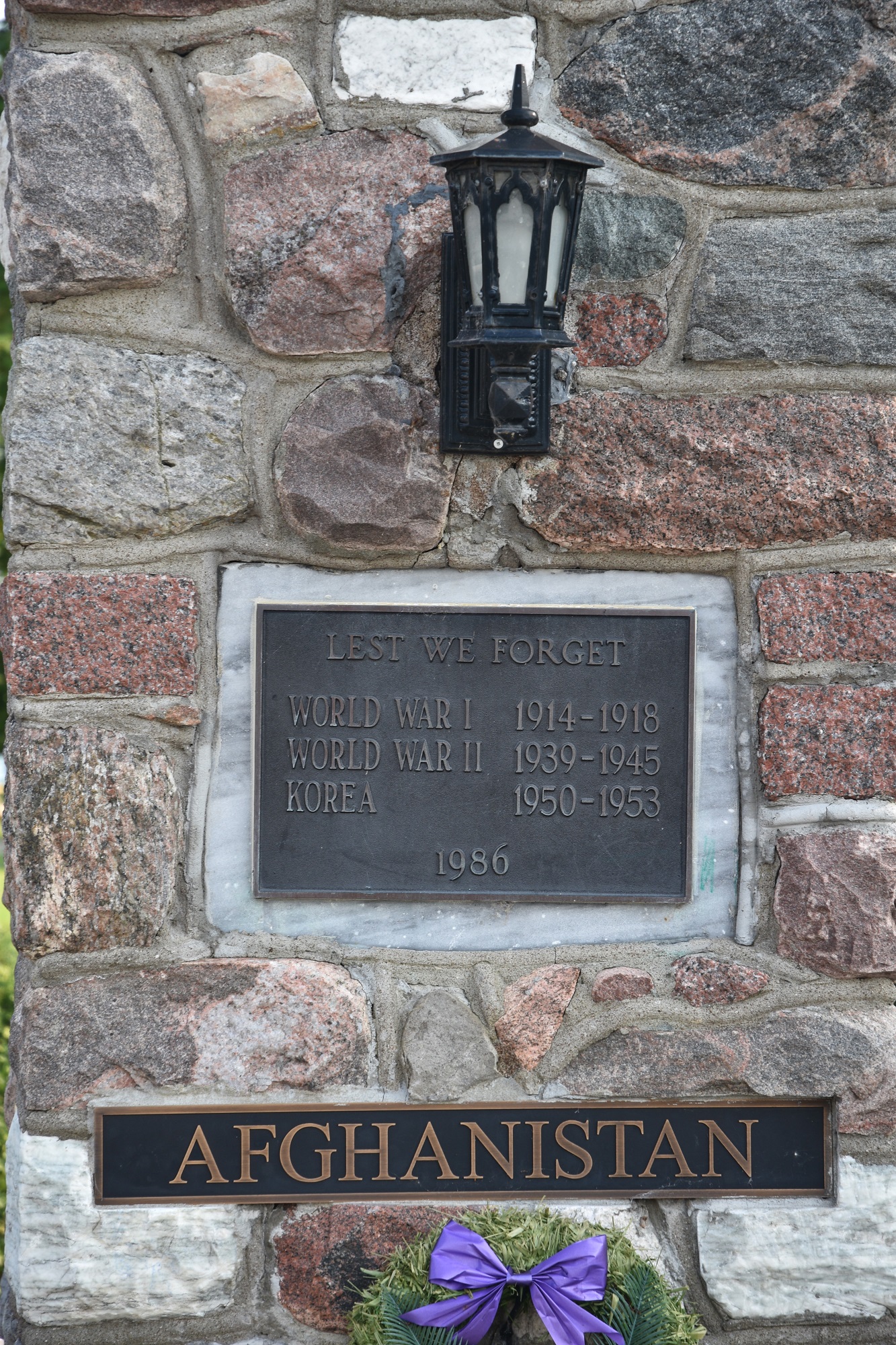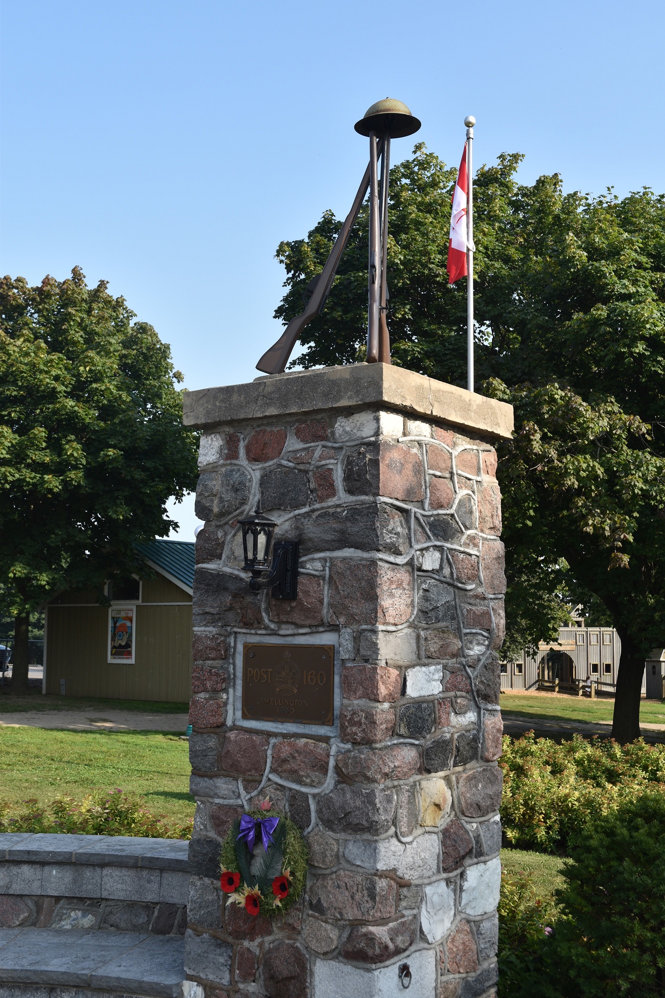 It was erected by the Royal Canadian Legion Branch 160 in 1930 and a dedication plaque was added in 1986. The cenotaph is dedicated to members of the Wellington area who served in the First and Second World Wars, Korean War and Afghanistan.