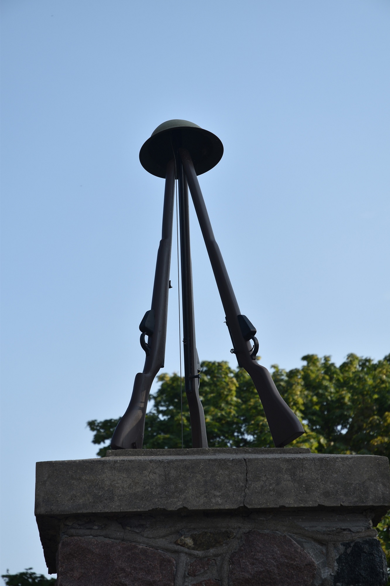 The Wellington Cenotaph is composed of two stone wing walls with benches, each leading to a pillar. On top of both pillars are three wooden rifles arranged in a tripod configuration and topped by a First World War era British helmet.