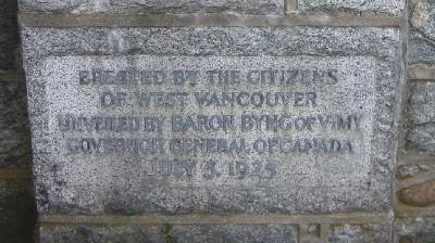 Constructed in memory of West Vancouver residents who lost their lives in World Wars I and II. A population of approximately 3,000 raised enough money to build the memorial on land donated by the Municipality. The Duncan Lawson Chapter, Imperial Order Daughters of the Empire, were primarily responsible for raising the money. The architect who designed the memorial was Mr. Theodore Frederick Korner, who was living in West Vancouver at the time. The stonesmason awarded the contract was A. McRitchie of Vancouver. The Memorial Arch was unveiled on July 5, 1925, by Baron Byng of Vimy, Governor-General of Canada. On Dec. 9, 1979, two granite plinths, with names of those who lost their lives in the Second World War, was installed in front of the arch. On July 24, 1988 a new granite inscription commemorating the Korean cease-fire was unveiled. In the fall of 1999, two-thousand tulip bulbs were planted at the site which were a donation from the Town of Diemen, Holland.