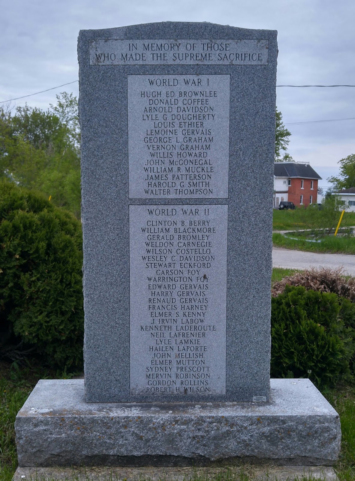 Two brothers on the cenotaph, Carson and Warrington Foy, were the sons of John and Mabel Foy. They died just weeks apart in the Second World War by friendly fire incidents. A Memorial Cross was sent to the family for each son, but were lost over time. In the fall of 2010, the medals were recovered from eBay and prepared for final display in the Westmeath Hall.
