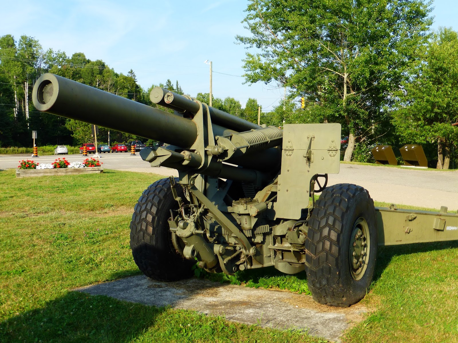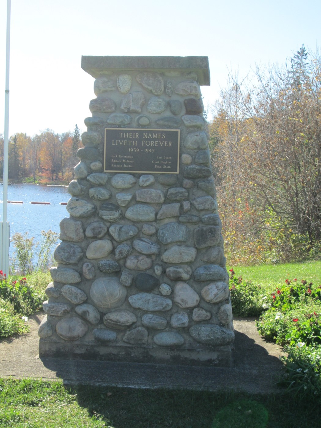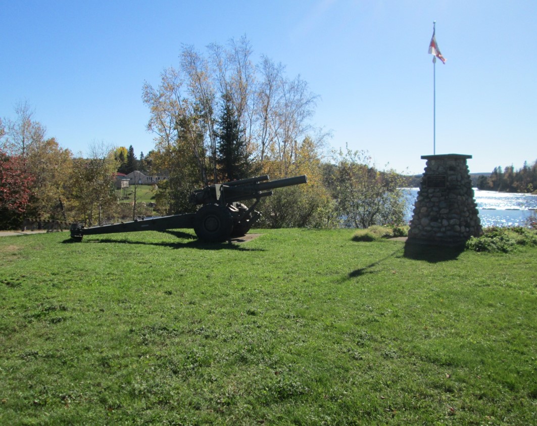 This cenotaph is dedicated to the men of the Whitney area who gave their lives in the Second World War. It was erected by the Town of Whitney, and consists of a stone cairn with an artillery gun. The artillery gun is a 155mm, made in Sorel, Quebec in 1955.