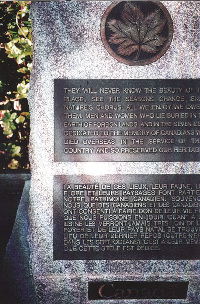 LA BEAUTÉ DE CES LIEUX, LEUR FAUNE, LEUR FLORE ET LEURS PAYSAGES FONT PARTIE DE NOTRE PATRIMOINE CANADIEN. SOUVENONS-NOUS QUE DES CANADIENS ET DES CANADIENNES ONT CONSENTI À FAIRE DON DE LEUR VIE POUR QUE NOUS PUISSIONS EN JOUIR. QUANT À EUX, ILS NE LES VERRONT JAMAIS. TRÈS LOIN DE LEUR FOYER ET DE LEUR PAYS NATAL SE TROUVE LE LIEU DE LEUR DERNIER REPOS (OUTRE-MER ET DANS LES SEPT OCÉANS). C'EST À LEUR MÉMOIRE QUE CETTE STÈLE EST DÉDIÉE