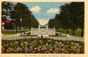 This memorial to the South African War veterans of Essex County was dedicated in 1906 outside the former Post Office. It was relocated to Jackson Park in 1932. Ouellette Avenue was extended in 1961, which forced the monument to be moved and re-dedicated that year. It now rests in the park's sunken gardens.