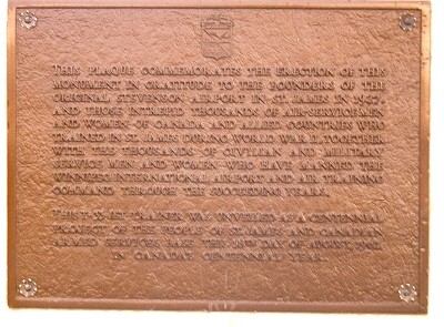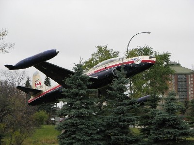This aircraft, a T-33 Silver Star trainer aircraft, was unveiled as a monument on 18 August 1967 by the people of St. James and Canadian Forces Base Winnipeg. It is dedicated to the founder of the Stevenson Airport in St. James in 1927, those service personnel who trained and served in St. James during the Second World War and those civilians and military personnel who worked at Winnipeg International Airport and Air Training Command after the war. This aircraft is painted in the paint scheme of the "Golden Centennaires" air force aerobatics team.