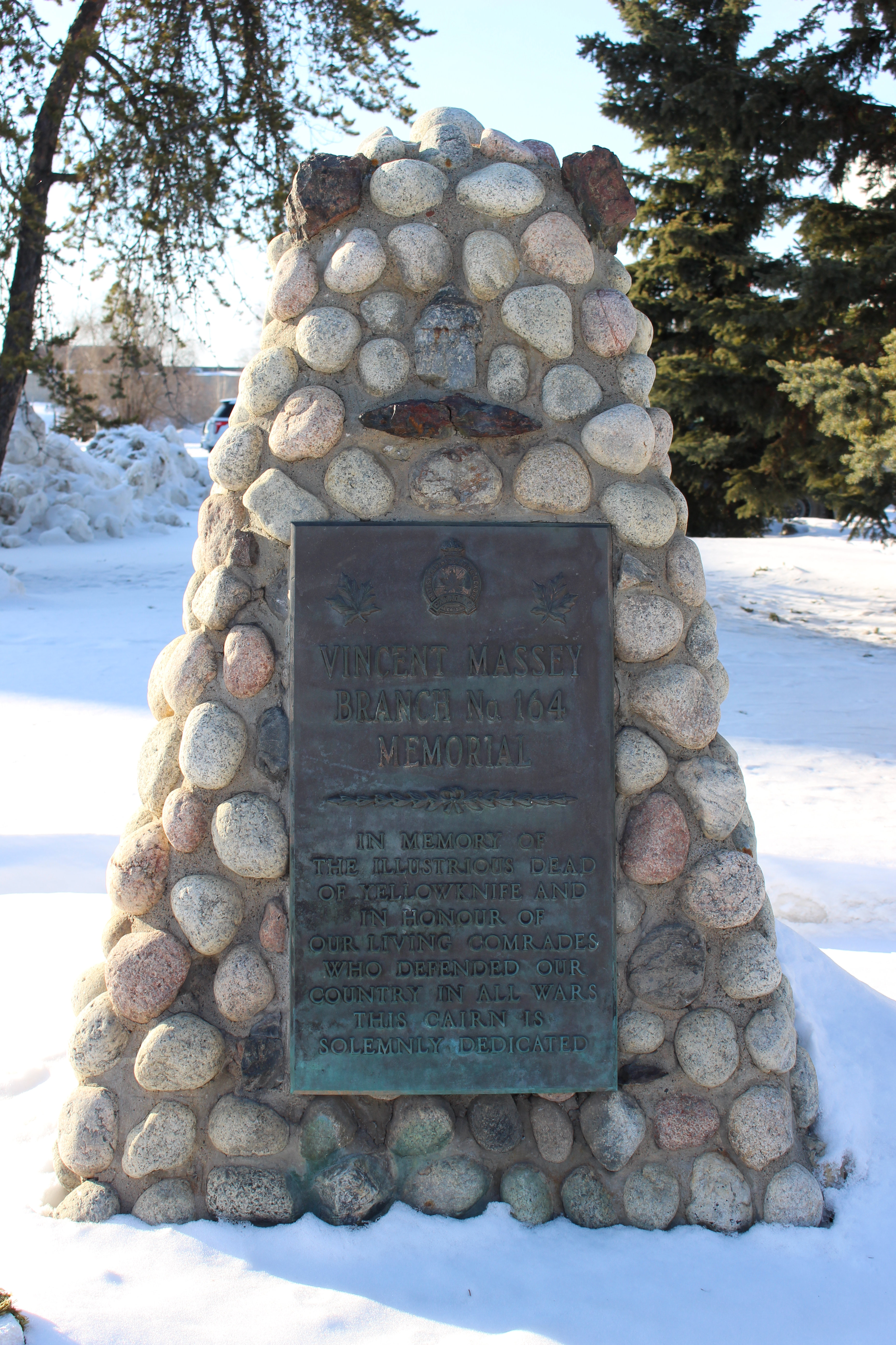 The cenotaph is four sided and made of rounded stones and cement.  The cenotaph tapers, with the base of the monument larger than the top.  The cenotaph sits on a concrete slab.  The cenotaph has a rectangular metal plaque on the front.  This can be seen by observers on the sidewalk of Veterans Memorial Dr (49th Ave).  The top of the plaque has a maple leaf, the Royal Canadian Legion crest and another maple leaf.  The maple leafs are angled to the outside by about 30 degrees.