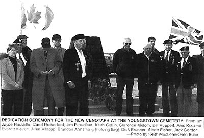 The Youngstown War Memorial was dedicated November 10th, 1999 in memory of all those who served in the Boer War (1899-1902), First World War (1914-1918), Second World War (1939-1945), the Korean War (1950-1953), and all Peace Keeping operations. The Memorial was planned and paid for by the Youngstown Cemetery Association, which is funded primarily by private donations. Remco Memorials did the construction and installation at cost, and Dale Crowle and Gladdish Construction, who prepared the concrete base, also made a generous donation to the Youngstown Cemetery Association. Excerpt from the Oyen Echo, November 16, 1999: Members of the Hanna Royal Canadian Legion #25 and guests from the Oyen Branch #208, students and staff of the Youngstown School and community members gathered for the dedication of the war memorial at the Youngstown Cemetery. In his dedication speech John Goodbrand, chairman of the Youngstown Cemetery Association said: "Today we commemorate 100 years of Canadian who served our country in the cause of justice, patriotism and freedom." A list of those who served from each of the four wars mentioned on the memorial, who has ever lived in the Youngstown area follows: Please note, that in the Second World War list the name *Roseland, Arnold Walter. He lived in the area as boy and in the July 14, 1999 issue of the Toronto Star he was named "The Unknown Canadian" after 55 years. BOER WAR VETERANS Athaws, Billy Creighton, Dr. James F. Donaldson, Charles A. Goodbrand, Alexander Meyer, Jake Munroe, Henry Smith Sutherland, Earl Synnuck, Harry Western, Tom FIRST WORLD WAR * Adshead, Harry Allan, William Anderson, Walter E. Arbogast, Charles B. Archeson, Ross Armstrong, George E. Auld, Paul Bain, Gregor * Baker, Bernard, G. Baker, C.C. * Baldwin, Jas. Alfred Baldwin, Reginald Barlow, Percy * Barnes, F.F. Batson, Cliff Beeton, George * Bennett, Rev. A.J. Bethel, P.F. Bilton, A.L. * Bonser, Edward T. Bourne, Henry Brady, Paul J. Brotherston, D.H. Brotherston, L.A. Brown, William * Brownell, Harry Bryan, William Burkhold, Ed Campbell, A. Campbell, Jack Ceser, E.C. Chapman, R.F. * Choate, Harold Church, Edwin Coke, U.V. Colpitts, L.M. Cotter, Charles Cragg, W. Cross, W.W. Cummer, Jack Cummings, W.J. Curtis, --- * Curtis, Joe Curtis, W.E. De Young, Arthur De Young, Wilfred Deverauex, M.T. Dickeson, Donald * Diffey, Herbert Dinwoodie, Dick Dinwoodie, George Dunnill, Stanley Edler, George Wesley Elliot, Jack Elmere, L.L. Enderton, Homer Falk, Harry W. Frakes, Robert Garland, R. Garlock, George Edward Garlock, Willard Edward Gaucher, John Sr. Genest, Alfred Goodbrand, John Goodwin, Richard Gough, W.H. Gray, Alex (British Army) Greig, Peter Griffiths,George Hagen, Benjamin * Hammond, G.A. Hart, Dr. Hugh H. Hart, Jerry Heasley, Wilfred * Heller, Dick * Herold, Ray C. Holbrook, Clyde Holmes, A. Huggins, Jack Hunter, Edward James, Norman Jenson, J. Jespersen, D.H. Jones, Lawrence Kay, Scotty Kidder, Harvey Kidder, Victoria H. Kirby, Frank * Koplin, William (died in camp) Leslie, George Loper, --- Lowe, James A.R. Lowther, C.W. * MacMillan, Wm. (died in camp) Manion, Arthur Austin * Marchant, --- Martin, Arthur Mather, Thomas Maw, John McCarthy, James * McColl, Douglas C. McDonald, D.M. McKay, Dan McKellar, Edmond McKinley, Clark McLean, J.D. McLean, Laughlin * McLeod, D.N. Middleton, Alex * Miller, E.J. Morrison, A.E.S. Muirhead, John M. Murphy, William D. Nasmyth, W.W. O’Hara, Barney Orrick, J.R. * Orrick, Joe (accidentally killed) Osborne, John Osmond, S.C. Paterson, William Pines, H.C. Portier, R.H. Pratt, E.L. * Quanberry, J.H. Reiner, Gotlieb Riley, Harry Ringrose, Frank Ross, Donald N. Shaw, George Shelton, W. Shepard, Ambrose Siegrist, Earl Simpson, Thomas C. Slingsby, E. * Smith, D. * Smith, Herbert Smith, W. * Spalding, Geo. Spencer, E.W. Sprotson, Dr. Stacey, L.G. * Stephenson, --- Stewart, Charles V. Stewart, Wilbur Sully, John A. Synnuck, Jack Tanner, Tom Tate, L.C. * Telfer, Andrew Tetlock, Cecil * Tinlin, W. (died in camp) Tovey, Edgar Trimner, Eldon Trogan,Eldon Trogen, Everet Trostle, Harry Turmoth, G.D. Twyning, W.S. Van Brunt, George * Van Brunt, H.G. Van Dyke, A. Vinton, Frank * Vinton, Fred Vinton, John * Wade, Harry Walsh, J.G. Watson, Ernest Watson, Robert Watt, Bruce White, A.E. White, M. * White, --- (died after returning) Whyte, M. Wigley, Art Wood, B.A. Zehren, J. SECOND WORLD WAR Allsopp, Allin Anderson, George Anderson, Gordon Anderson, Ray Anderson, Wilfred Andrew, Norman Armstrong, Jim Armstrong, W. Ashmore, Robert Auld, Walter Bannick, Herb Bartman, Gordon Bartman, Lloyd Barton, Donald Beamish, Emily Beamish, Winifred Berg, Art Berild, Chris Berild, John Bertsch, Bill Blair, Harry Blair, Robert * Bohush, Eugene Bohush, Russell Boswell, Jim (British Army) Brewer, Allen Buckley, Joseph Buckley, Thomas Burrows, Norman Butler, (Hampton) Elsie Butler, Jack Clark, Alfred Clark, Ralph Clark, Wesley Clarkson, Douglas Coad, Ransom Coffin, Delbert Coffin, Keith Coultis, Violet Daley, F.J. Day, George Demaere, Ted Dewey, William H. Douglas, James * Douglas, William Lloyd Eccles, Gorm Edwards, Charlie Edwards, Dave Edwards, Kenneth Elliot, Jim Elliot, Tommy Elliott, Harvey Gaucher, John Sr. Gaucher, John Jr. Gaucher, Lloyd Givens, George Goodbrand, Jim Gordon, Albert Gordon, Charles Gordon, Jack Gordon, W.A. (Ab) Greer, Bill Grover, (Smereka) Lois Gurnett, Bill Hall, Norman Hall, Wesley Hettler, Adam Hettler, Joseph Hughs, George Hunter, Eddie Hunter, George Hunter, Gordon Hunter, Harry Hunter, Ted * Jackson, Henry Jackson, Mary Johnson, Earl F. Johnson, Norman Johnson, Ralph Johnson, Ted Kachman, Roman Kerner, Jim King, Alex Kleven, Everett Kuczma, Alexander Paul Larson, Ernie Laughlin, John Laughlin, Mervin Lougheed, George Lougheed, Lloyd Lynn, James Jr. MacDonald, Jim Maxwell, Thomas McKeage, J. Mellom, Alden * Mellom, Arthur Mellom, Clarence Mellom, Julius Mellom, Lawrence Munroe, Alex Munroe, Arthur Munroe, Jack Naismyth, John Niles, Isabel Paetz, Henry Pahl, Emerih Pah