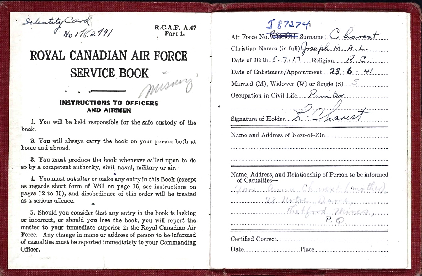 He was a soldier in the Régiment de la Chaudière in Mégantic, Quebec, from November 22, 1940 to December 21, 1940 under the NRMA of 1940. He signed Laurent Charest.