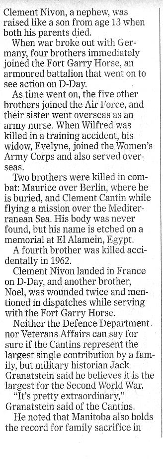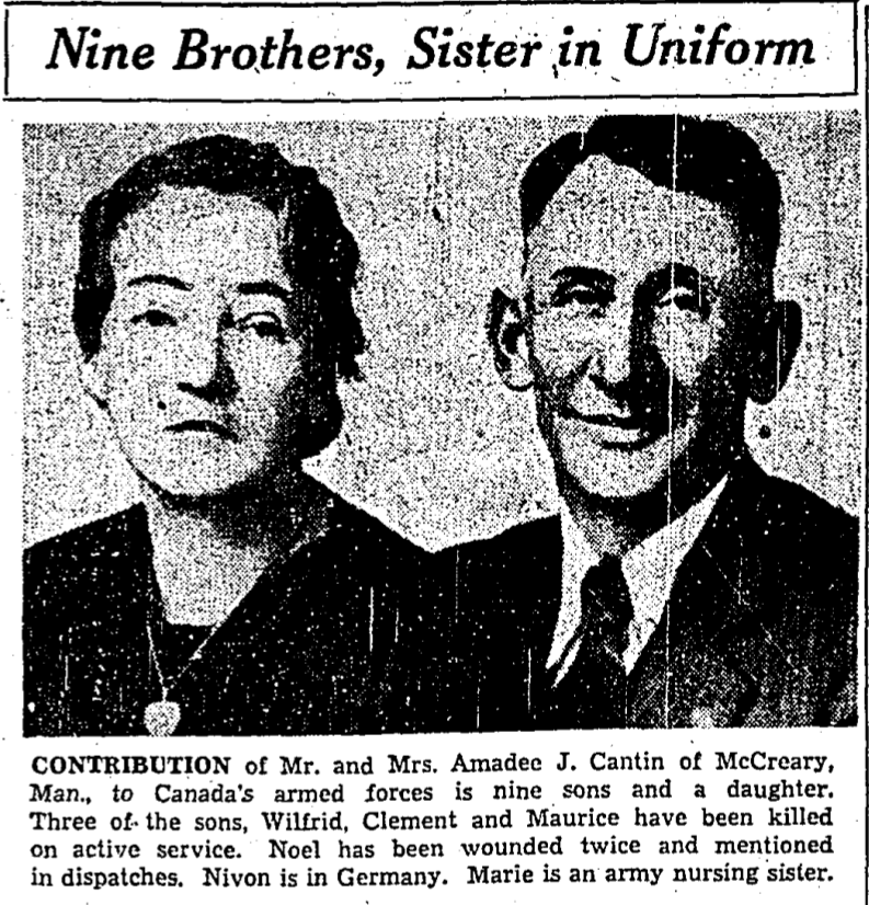 Brother of Flying Officer Maurice Raoul Cantin, deceased November 26, 1943 and Private Wilfred Cantin deceased November 4, 1940.