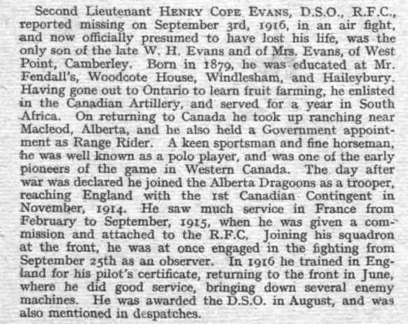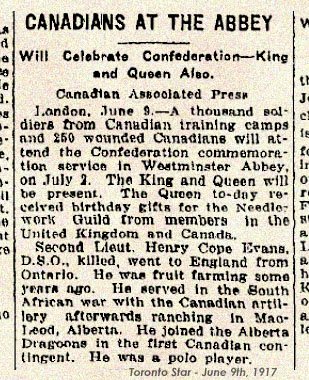 Son of Alice M. Evans of West Point Camberley, Surrey, England. Lieutenant Evans had previous with the Canadian Artillery, "C" Battery in the South African War. He stated that he was single and employed as a rancher. For a period of time,prior to the war, he was engaged in fruit farming in the Province of Ontario, then returned to ranching. He joined the Alberta Dragoons and went to France with the first contingent.