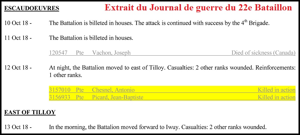 Enlisted in the 2nd Depot of the 2nd Quebec Regiment, he arrived in Liverpool, England, on 28 April 1918. He was initially posted to the 10th Reserve Battalion of the Canadian Expeditionary Force. On 11 September 1918, he was transferred to the 22nd Battalion and landed in France the same day. He was killed in action on 12 October 1918 at Tilloy-les-Cambrai during the Battle of Cambrai.