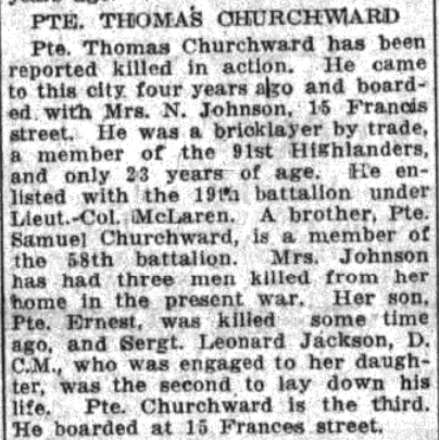 Son of Thomas and Sarah Churchward, of "The Hayes," Stoke Gabriel, Totnes, Devon, England.