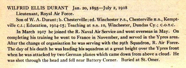 Commemorated on the Chesterville Cenotaph, Morewood Cenotaph, and Wilfrid Ellis Durant Memorial.