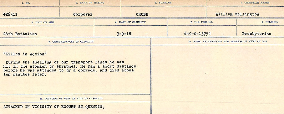 Son of Samuel and Jane Chubb, of Valor, Saskatchewan; husband of Grace Chubb, of 13, Great Alie St., Aldgate, London, England.
