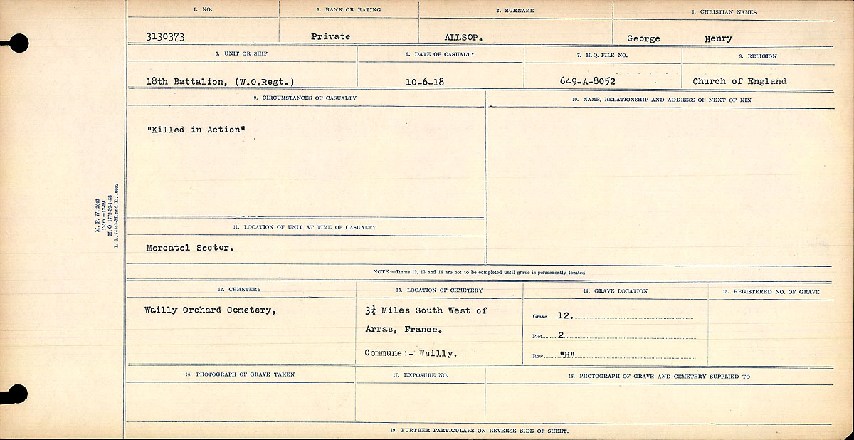 Wailly is a village in the Department of the Pas-de-Calais about 6 kilometres south-west from Arras in the valley of the little river Crinchon. WAILLY ORCHARD CEMETERY stands above the village on its outskirts in part of the old orchard.