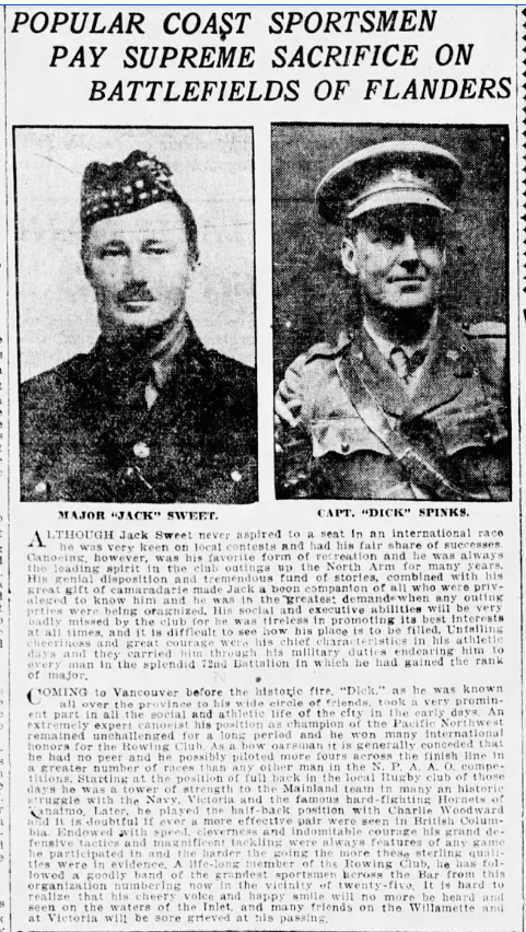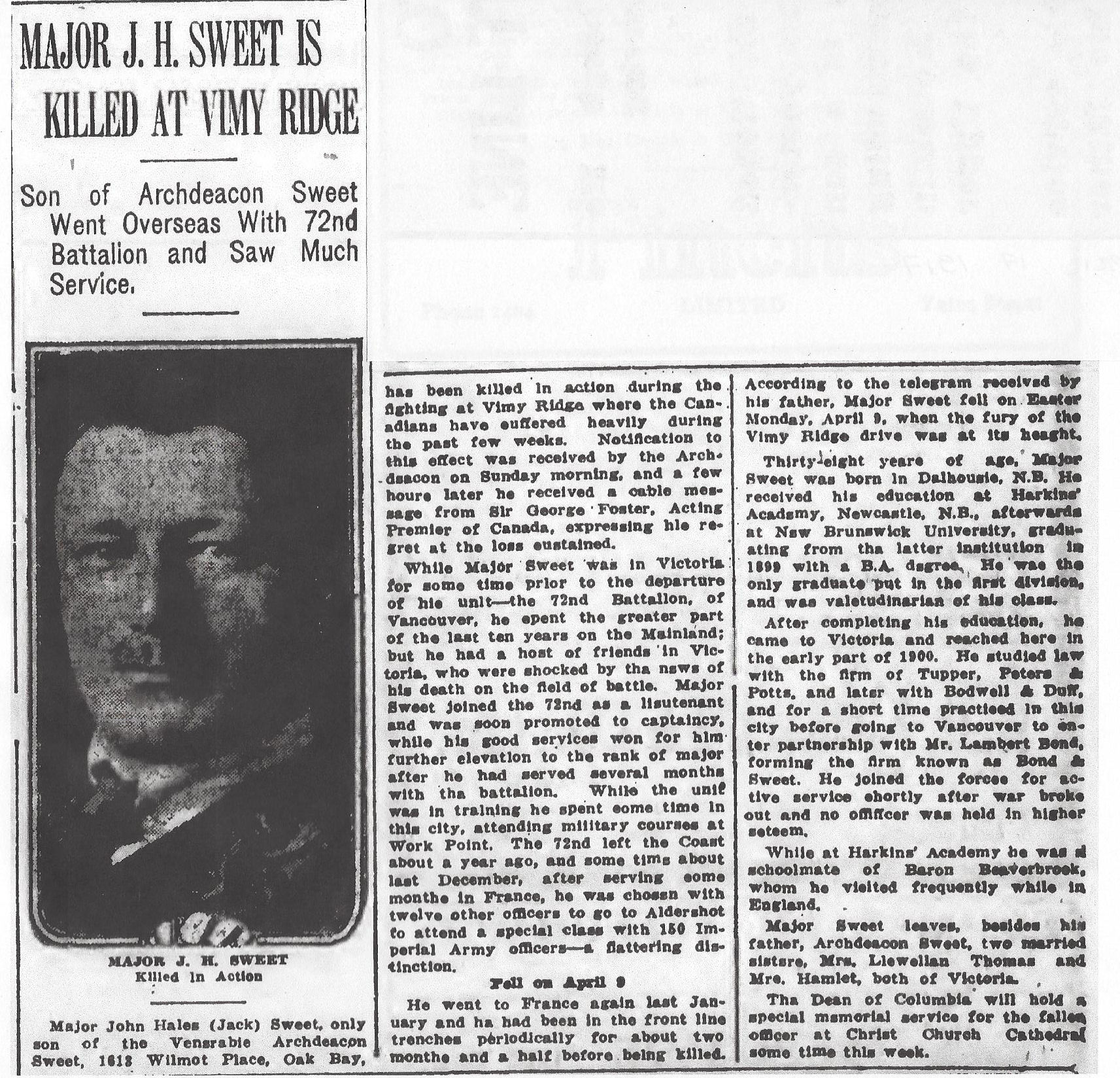 Son of The Ven. Archdeacon J. H. S. Sweet and Mrs. Sweet, of 1613, Wilmot Place, Victoria, British Columbia. B.A., New Brunswick University. Member of the firm of Messrs. Bond and Sweet, Barristers, &C., of Vancouver. Born in Dalhousie, New Brunswick.