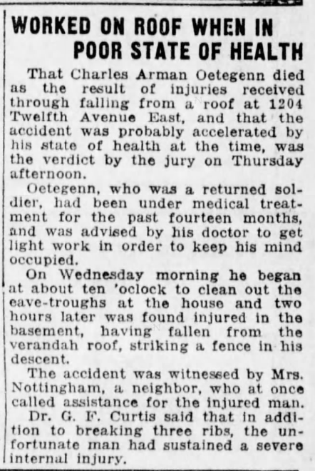 Son of Margaret Oetegenn, of Greenock, Scotland, and the late Charles Oetegenn; husband of C. Agnes Oetegenn, of 150, 58th Avenue East, South Vancouver.