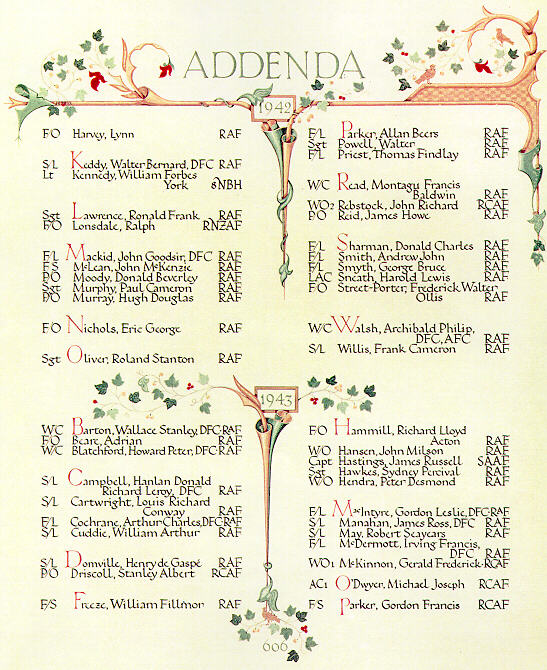IN THIS CLOISTER ARE RECORDED THE NAMES OF TWENTY THOUSAND AIRMEN WHO HAVE NO KNOWN GRAVE. THEY DIED FOR FREEDOM IN RAID AND SORTIE OVER THE BRITISH ISLES AND THE LANDS AND SEAS OF NORTHERN AND WESTERN EUROPE