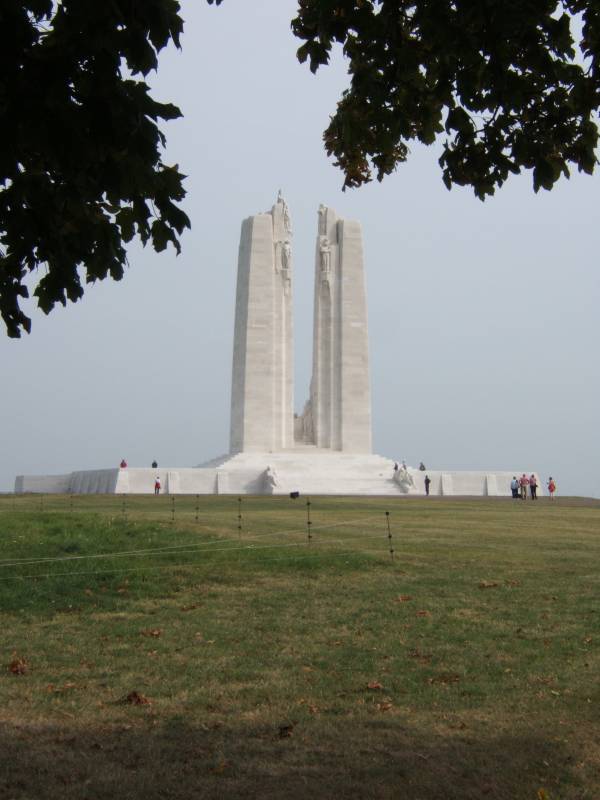Canada's most impressive tribute overseas to those Canadians who fought and gave their lives in the First World War is the majestic and inspiring Vimy Memorial, which overlooks the Douai Plain from the highest point of Vimy Ridge, about eight kilometres northeast of Arras on the N17 towards Lens. The Memorial is signposted from this road to the left, just before you enter the village of Vimy from the south. The memorial itself is someway inside the memorial park, but again it is well signposted. At the base of the memorial, these words appear in French and in English: