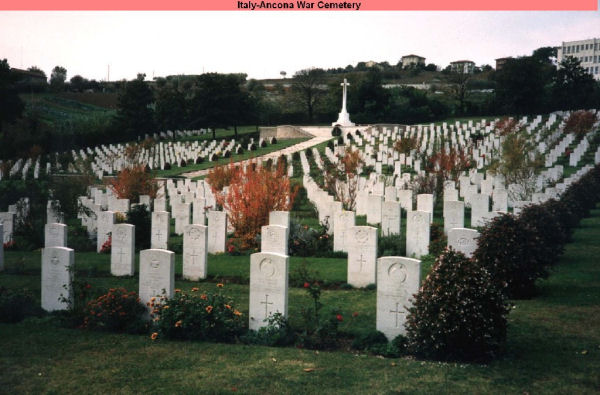 The ANCONA WAR CEMETERY is reached from the town by following the Varono-Camerano road up the hill past the Ancona Communal Cemetery on the left. Continuing straight down the hill for about 200 metres, visitors will find the War Cemetery on the right.