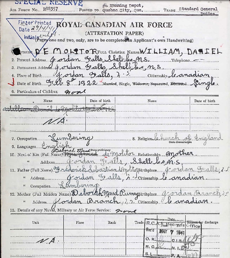 Son of Frederick Sebastian and Deborah Maud de Molitor, of Jordan Falls, Shelburne Co., Nova Scotia, Canada.