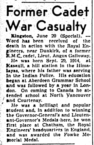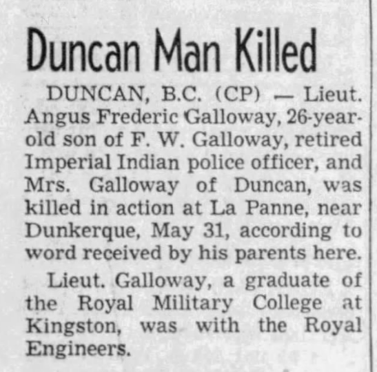 Son of Frederic W. and Edith A. GallowaY, of Duncan, British Columbia, Canada. B.A., Hons. (Cantab.). Awarded the Governor-General's and the Lieutenant-Governor of Ontario's Medal at the R.M.C., Kingston. Also awarded the Fowke Memorial Medal (Chatham).