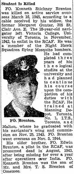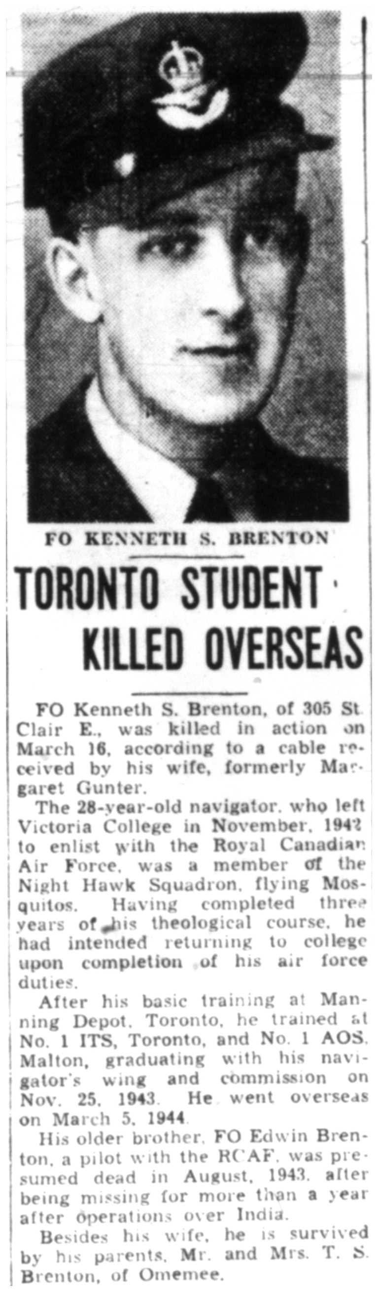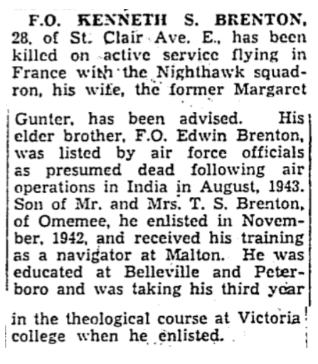 Son of Thomas S. and Isabel May Brenton, of Deseronto, Ontario. Husband of Margaret Lillian Brenton, of Toronto, Ontario. Brother of Edwin Swayne who died on August 15, 1943 while serving with the Royal Canadian Air Force.