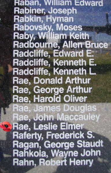 Brother of Harold Olivier Rae who died on June 25, 1944 while serving with the Royal Canadian Air Force and Thomas Rae who served with the Royal Canadian Navy.