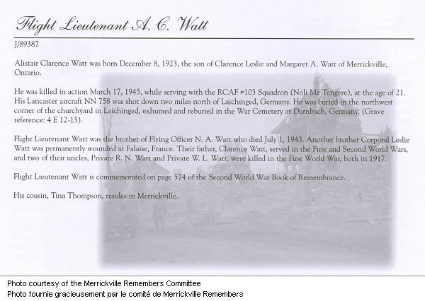 Son of Clarence Leslie and Margaret A. Watt, of Merrickville, Ontario. Brother of Flying Officer Norman Watt, who served with the Royal Canadian Air Force, died on July 1, 1943.