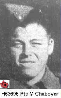 Son of Joseph Edmond Chaboyer and Marie Emma Ducharme, of St. Laurent, Manitoba. Husband of Rose Coutu. Cousin of Privates Chrysostôme Chaboyer, who fought in Europe, and of Wilfrid Chaboyer, service number H-41693, Winnipeg Grenadiers, prisoner of war in Hong Kong, both survived the war, and cousin of David J. Chaboyer, service number H-41688, Winnipeg Grenadiers, killed in action in Hong Kong on 19 December 1941.