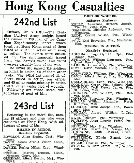 Served as a cadet in the Highland Cadets, Signal Branch, from 1915 to 1916, in Manitoba, then with the Winnipeg Grenadiers in Bermuda with B Force, in Jamaica with Y Force, in Hong Kong with C Force.