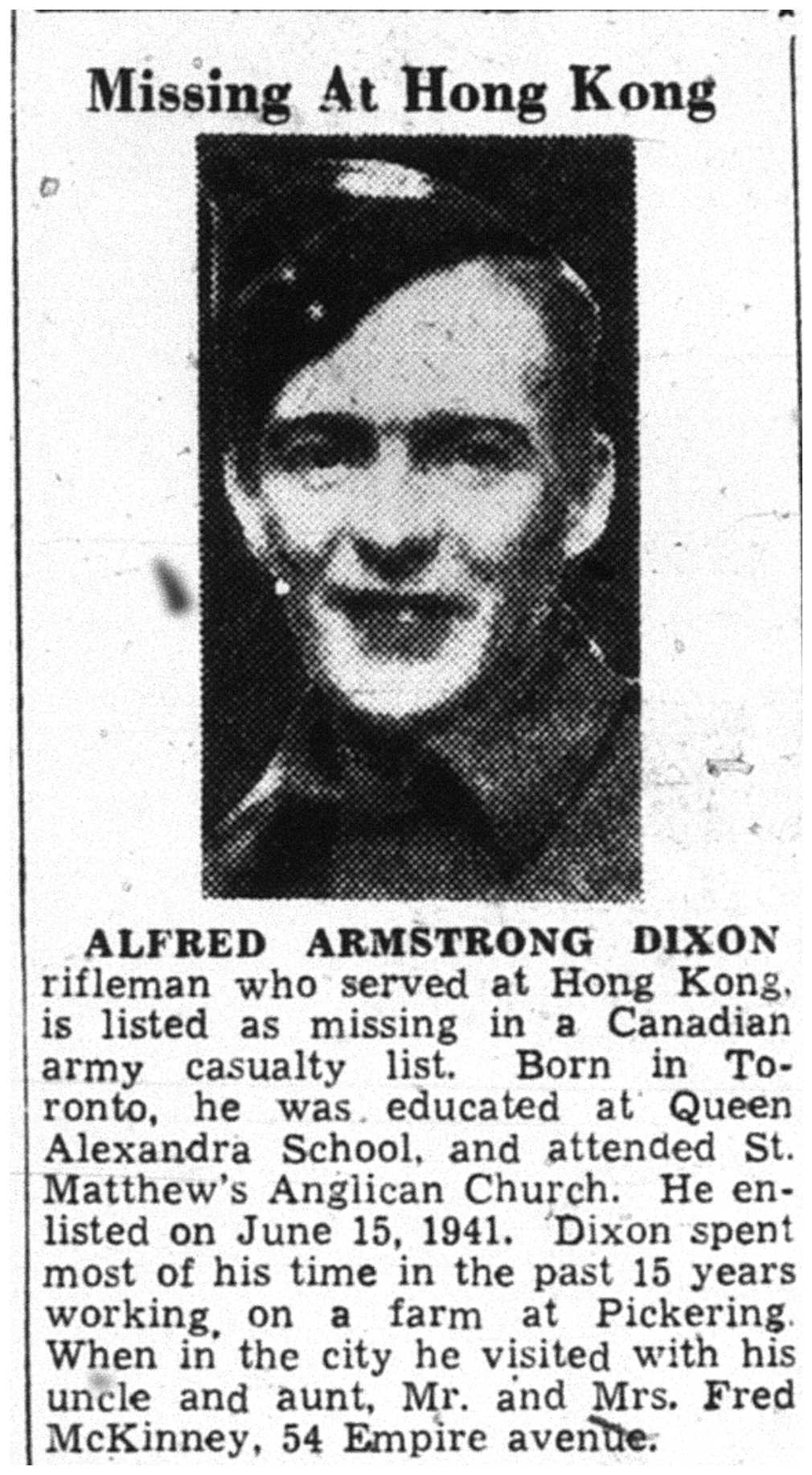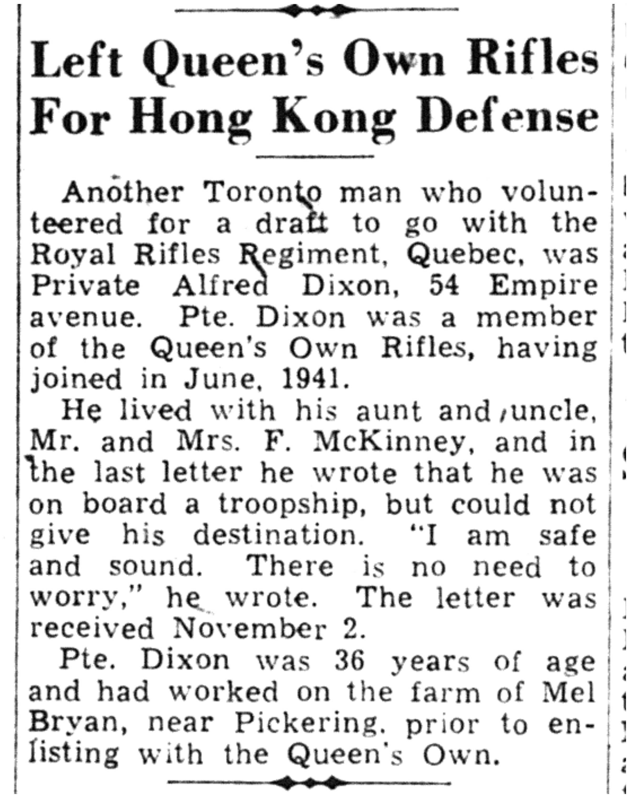 Enrolled in the Queen's Own Rifles of Canada - NPAM - in 1939, then in the regular forces of the 1st Battalion of that regiment on June 17th, 1941, served in Ontario, New Brunswick, transferred on October 18th, 1941 to the 1st Battalion of the Royal Rifles of Canada and sent to Hong Kong with C Force. He had 193 days of service, including 60 overseas.